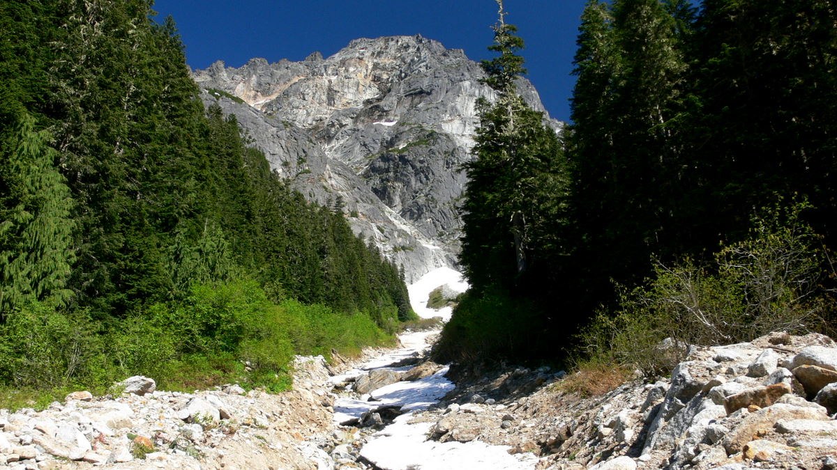 And then some really spicy excitement at the end, where an enormous landslide some years back came off the face of Sloan with what must have been the rumble of 50 freight trains and obliterated whatever trace of the trail led up the final half-mile to the basin, leaving us to pick our way upward and look for tracks and sniff the wind and otherwise engage in that peculiar black art known as "route-finding." There's a 4x4 planted against the downhill side of a boulder at the start of this, just waiting for a sign to say "Wherever you go, find this when you come back down." We angled left, up the slide chute, which looked better than crossing Bedal Creek into a jumble of brush that would scratch you up good. The bootmarks we found cross the creek in the slide gully below the snow-bridge, angle up the right-hand embankment, then disappear into the steep woods.