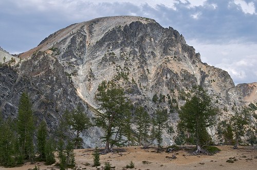 And a climb it was. Gaining some ~1500', in such a short distance, without a single switchback, with a 45lb backpack, was quite difficult. I had to watch every step, avoiding loose rock that sat on dry slopes ready to slide away beneath me. I stopped every several steps, sat down dozens of times, sometimes right on the path. Marmot's whistles and pika squeals kept me company. A weasel ran right behind me, startling me up from a spot I might still be sitting today otherwise. Larch trees appeared sporadically amongst the others. I could guess at the distance remaining above me. On my final approach, my quadriceps nearly burst into spasm.