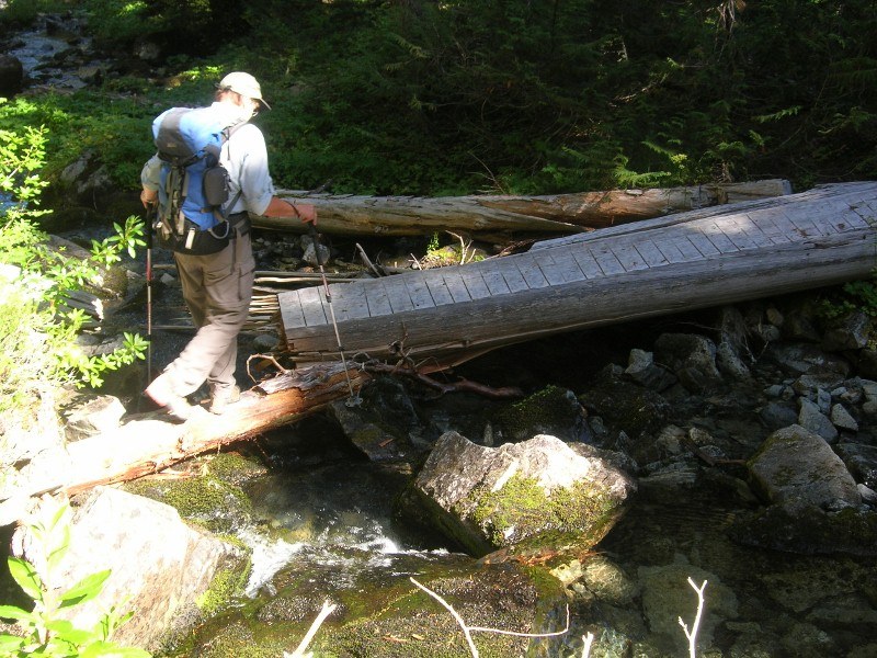 Picturesque Forest Lake has an established camp site, bear wire and privy. With a stream nearby, it's a perfect late summer, bug-free destination for new backpackers & kids. We enjoyed our lunch break then continued for another mile or so down the trail before turning around, and were thrilled to spot a large buck through the trees. One stream crossing has a broken log bridge, though easy to cross this time of year. The trail continues for some 5 more miles to the park boundary ... another time perhaps.