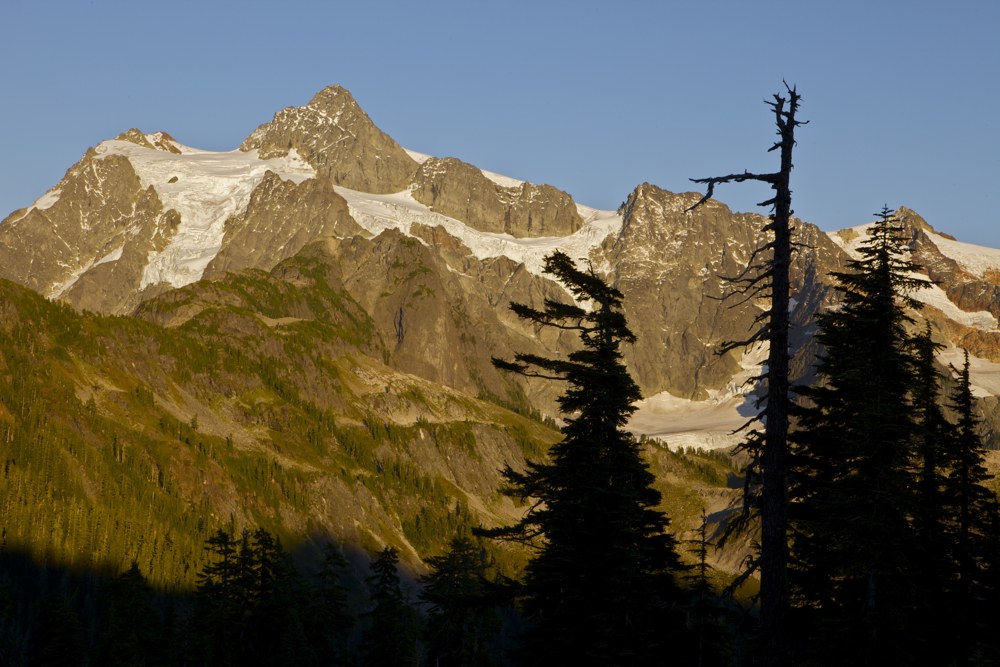 After consulting my list of destinations, I found one that had languished for years due to its proximity to a 200 car parking lot. That liability became its asset. No way could I sit home with grand September sunshine gracing our beautiful Cascades. My destination was less than a half-mile and 500’ descent; a secret tarn only seen from a distance some years ago. I arrived early at the departure point, a vast sea of asphalt crosshatched with paint stripes, so no one would witness my hobbling madness (it looked like it was painful, but not at all). I gimped the gravel path, tread more by white shoes and flip-flops than hiking boots, to the end of the tourist grade trail, and pointed my toes downhill. A faint track dropped steeply (for a disabled person) over rock and through brush. I felt good with each careful step; I was already in fabulous meadows with tiny tarns, but the smell of a golden destination kept me going. At one point I strayed into a fading track that ended in steep brush above a cliff; I retraced my steps and found the proper track, more to the north side of the ridge. It soon entered ridgeline hemlock forest; this was the most difficult stretch. The track became steeper with an accompanying layer of slippery needles. I was thus delivered into my private little nirvana: a perfectly sized tarn surrounded by tiny tarns; and cozy pocket meadows nested with curling yellow grasses. Easy views to the Celebrity Mountains of the area, Kulshan & Shuksan, completed the charm.