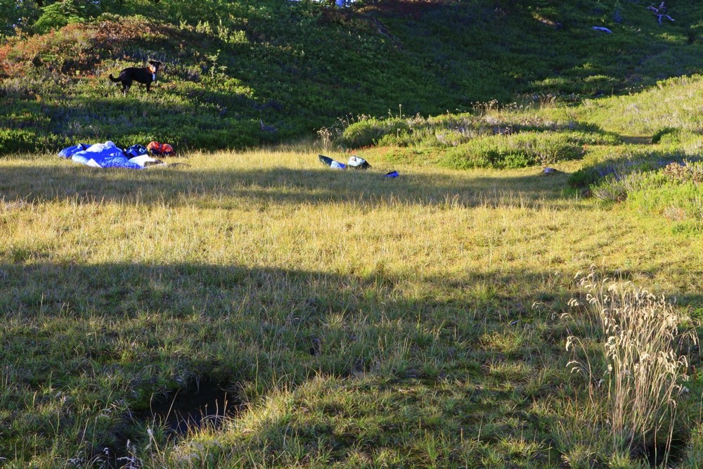 I laid out our bags out in one of the higher meadows away from the tarn to keep the dew to a minimum; we had a couple of tiny tarns for water. My convalescent stay involved nothing more than shuffling about in sandals or slippers, picking blueberries (5 quarts), taking photos, drinking wine, skinny-dipping, and losing sleep under an inspiring star dome. A waning moon sharpened during our 2 night stay, and a horned owl called in the gloaming hours of the evening. Bodhran delighted in foraging for berries, and wading about in the large tarn during our warm azure days. Except for the occasional posse of HDs roaring harmlessly in the distance, it was a very quiet place. Gnats were another harmless pest, but only in the pre-dawn hour).
