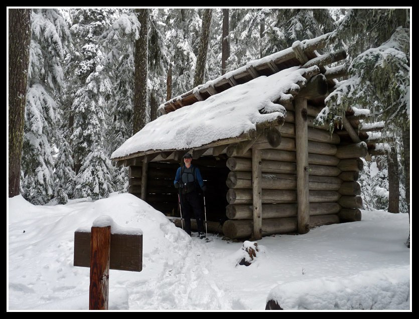 At the 2.8 mile mark we reached a short spur to a viewpoint. The clouds were low and we had no views. Well, it was soon time to head higher. We had a little snow on the trail before the 3800' viewpoint but not much. The trail traverses a steep hillside. It would not be much fun if there was more snow. Above 4500' there was snow on top of a thin layer of ice. Footing was okay but we all slipped a few times. At 4.8 miles we reached the shelter. The building is in good shape and would be even better if folks had not had a fire on the floor inside. It smells of smoke now. We had a short break and headed out.
