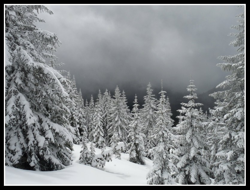 The way was almost entirely in forest. Where the trees thinned the snow was markedly deeper. Up to 8+ inches of new snow. We had to cross one open slope. The snow was very dry and powdery. I went first and found more of the snow over ice to deal with. Once across the others followed. When the route seemed to disappear we switched back to the left and picked it up again.