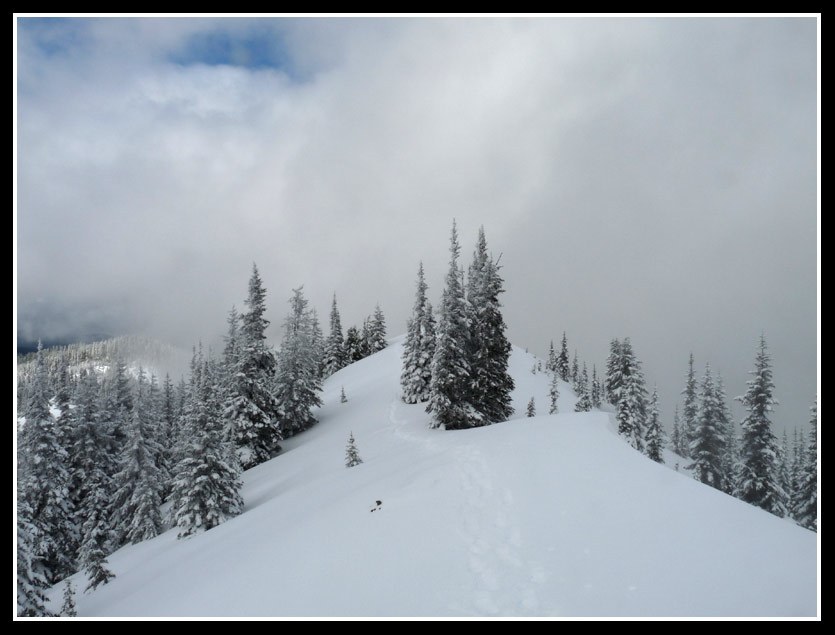We knew we were within less than 100 vertical feet of the Dalles Ridge Trail and the traversing was so tedious and slow that when an opening presented itself we headed straight uphill. The Dalles Ridge Trail was obvious enough though deeply buried by snow. We kept going higher and a few minutes later reached the ridge top at a saddle. The map confirmed that we were between Point 5600+ and Point 5781. It took us 2 1/2 hours to travel the first 4.8 miles. It took nearly as long to do the next 1.2 miles. Though we were less than 2 miles from Noble Knob there was no change to get there and back before midnight.