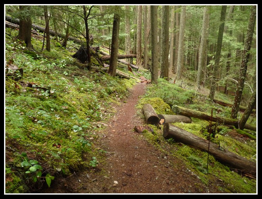 It took a few minutes to figure out where the trail went. A cut log was the clue that put us back on track. The new snow was 4-6" deep now but we continued on without snowshoes. With a few miscues we were able to stay roughly on the summer trail though the snow became deeper. Before long the snowshoes went on. The trail then began a long climbing traverse. With 3/4 of a mile to go to the Dalles Trail junction it was all side hilling. Our pace slowed way down. Some steps in the soft snow held and others knocked off the new snow and left us to try stomping a step into the hard ice.