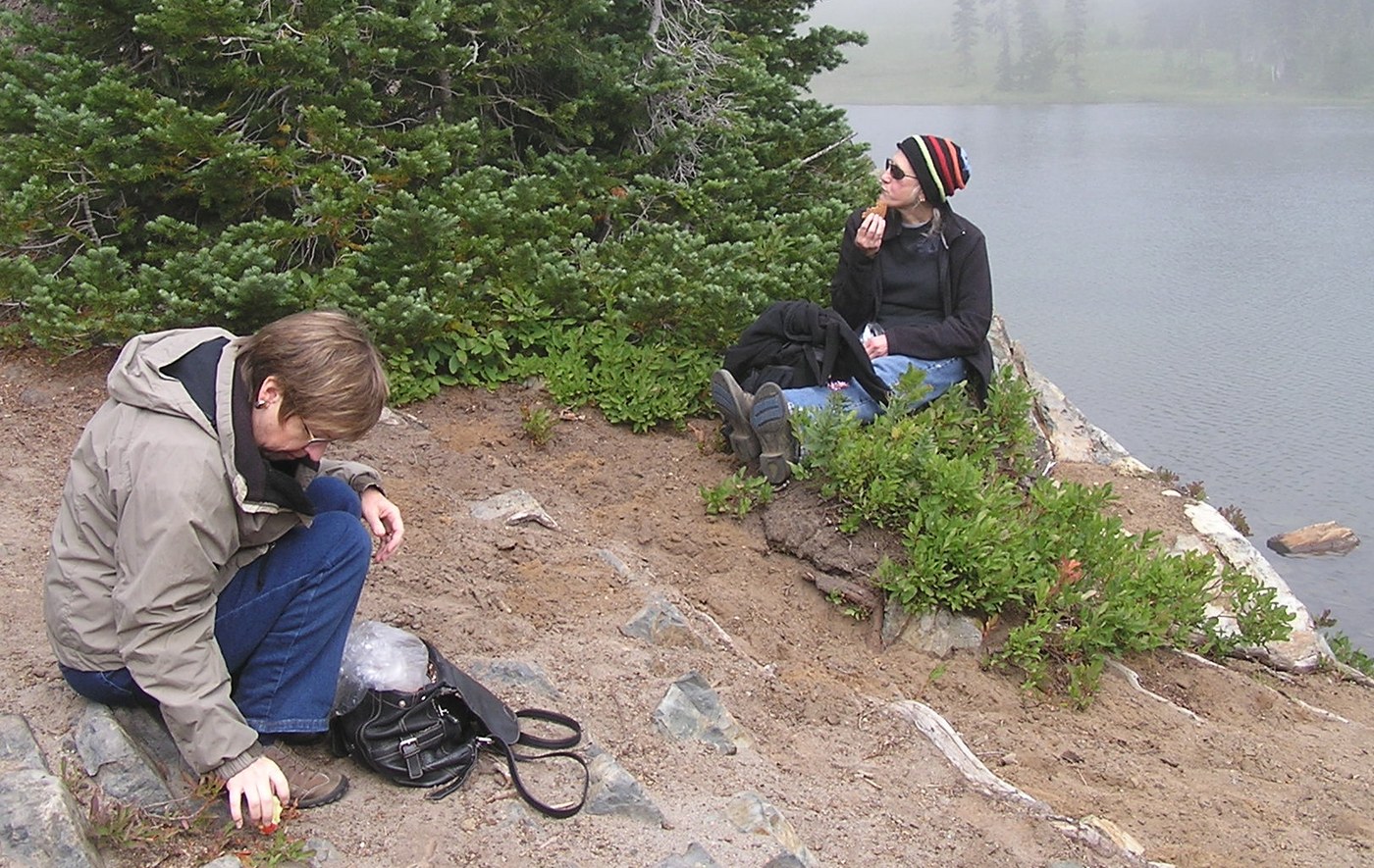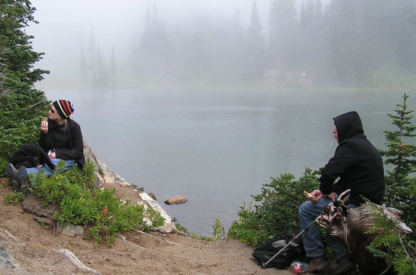 Once over Chinook Pass the fog began to lift and we had sun patches on the way to Sheep Lake. The trail was in good shape, somewhat dry despite the weather and most amazingly with flowers still in bloom. We saw Mountain Pasqueflower (Old Man of the Mountains), Indian Paint Brush, Lupine, and Golden Daisy. The flowers were past their prime but still beautiful. We also found some huckleberries on the early part of the trail which were good eating.