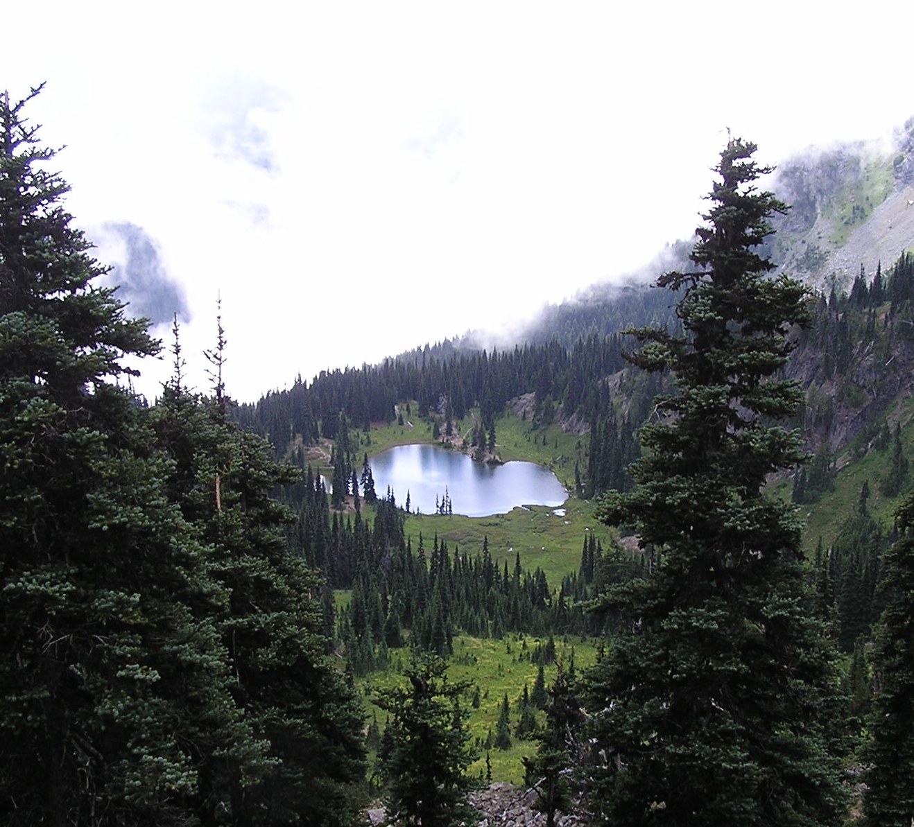 In the fog the trail over Chinook Pass to the PCT was hard to see so we wound up on 410 to the trail head. I noted with sadness that the PCT trail bridge over Chinook is down (been a few years since I was last at Chinook Pass).