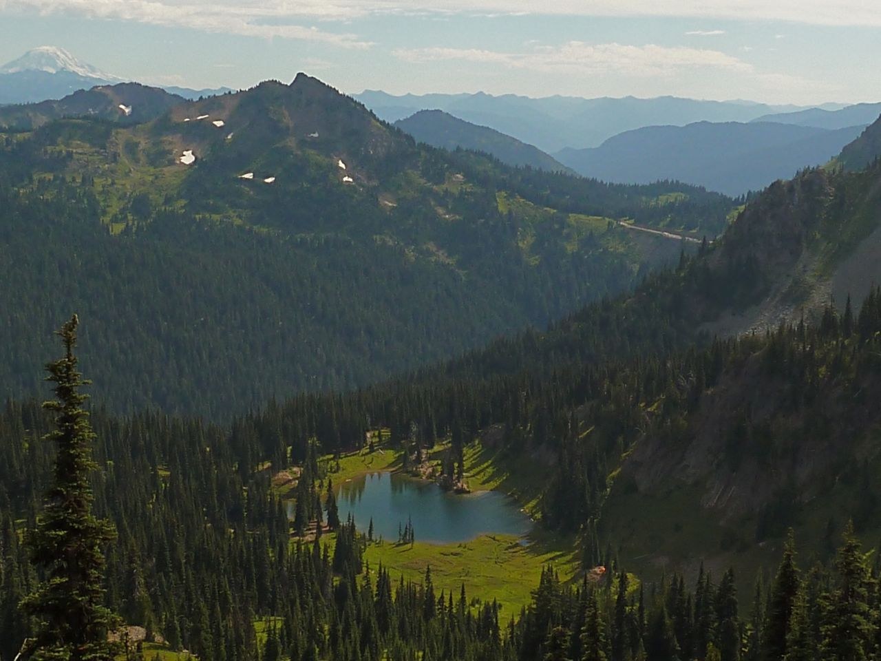 We parked 0.2 miles east of the park boundary at the TH for the PCT. The trail is 6 miles RT from here with an 1100 foot gain. We had a beautiful sunny day and almost no wind at the gap! We have done this trail several times before and the weather has always been cold, windy, and foggy at the gap so this was a very pleasant experience allowing us to rest here for awhile. Bob went east of the gap along the ridge for a better view of Mt Rainier than we had seen on the way up. Mt Adams, the Goat Rocks and Mt St Helens could be seen in the distance. There were several camped at the lake and we met many day hikers coming out as we were going in. We talked to 2 groups of through hikers along the way. Coming down from the gap we spotted 4 goats on a ridge west of the lake. The berries along the beginning of the trail seemed small and dry and didn't say, "Eat me!"