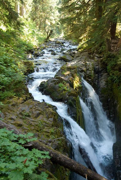 I know it was a holiday weekend, but WOW, this is a popular hike. You have backpackers accessing the High Divide, hikers headed to Deer Lake and hordes of folks walking just to the falls. The hike is actually much shorter than Craig Romano's guidebook and his Hiking Guide entry here at wta.org suggests. Few people that I saw had started their journey at the resort. Instead, they drove to the road's end and filled up the enormous parking lot (like we did). This makes the hike only about 1.6 miles roundtrip instead of more than 5 miles.