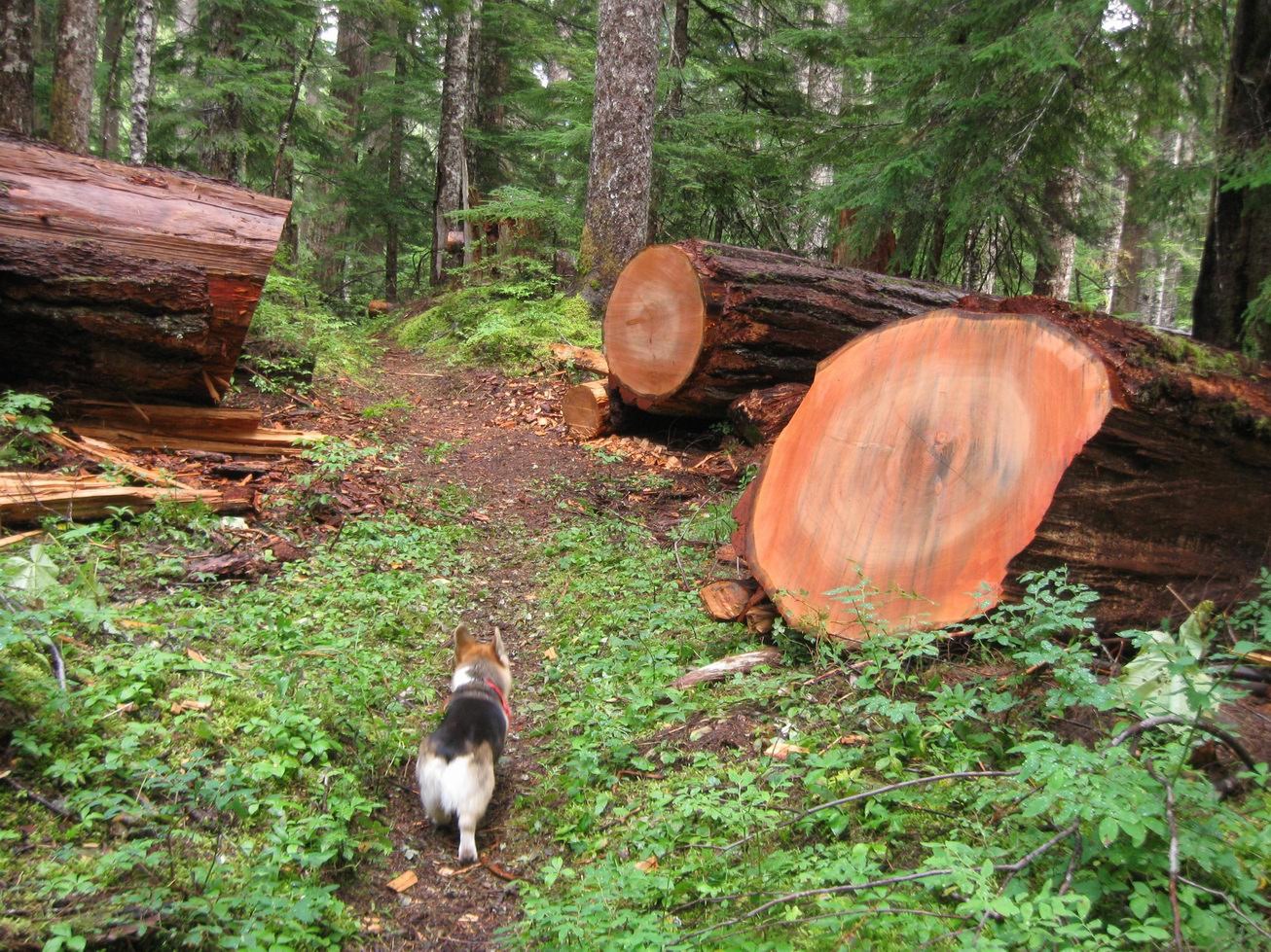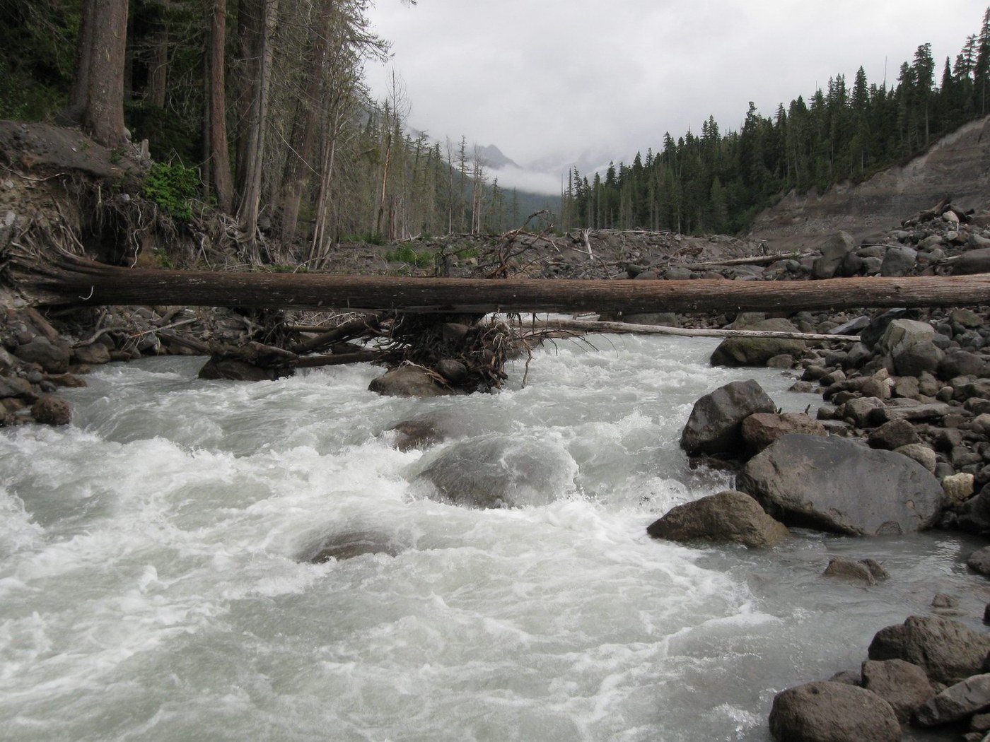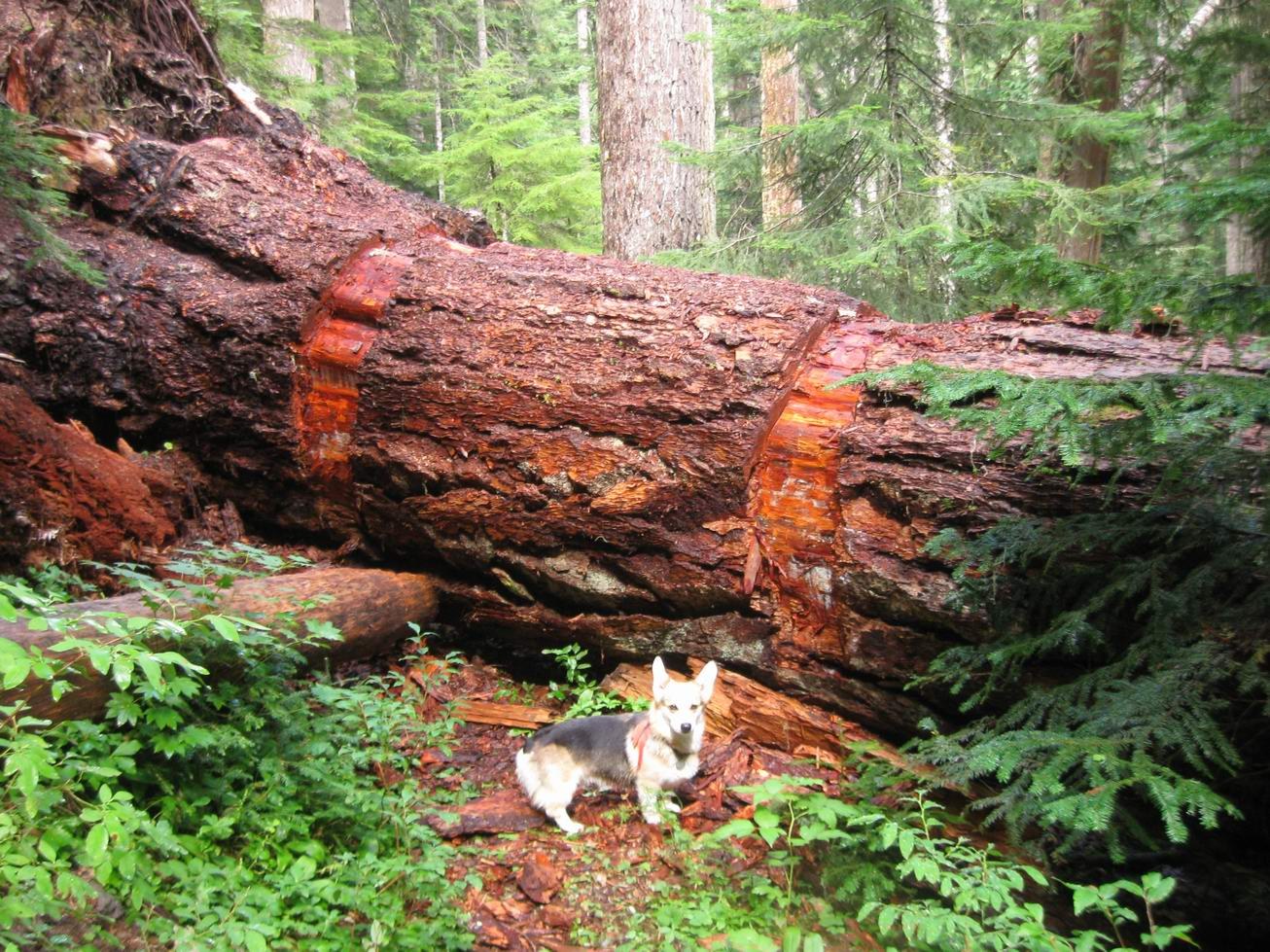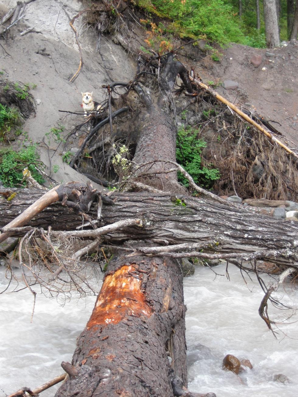 Glacier Peak Loop. 8 Two-Dog nights with only one dog. Mostly lazy days, late starts and early camps. DAY 1 9/4 Lost Creek Ridge. Locked in to vacation schedule. 80 deg F. in Seattle the previous day. Weather moving in, cool, overcast, good for climbing with a load. Stash pack at TH, park @ N Fk Sauk #649, car empty, unlocked, bike back. Trail in good shape. Maintenance stops at Round Lake, this shows immediately, progress slows. Spoke 7 bear hunters; glad to have my day-glo hat and safety vest (weighs nothing) since my rain gear is all black (I found it, wouldn't have bought black clothing). The hot-pink/baby-blue anorak seemed suddenly less ugly. Orange pack. Camped on barren sand flats on divide between Camp & Byrne Lakes, 200m visibility. DAY 2 9/5 Lost Creek Ridge to Kennedy Hot Springs, Kennedy Ridge Tr #639 to Pumice Ck on PCT. Start delayed by rain and sticking snow. Portentous. Intermittent showers all day. Wet brush, soaked. Trail rough below Lake Byrne for a few hundred feet; smooth after it drops into forest. Some blowdown but not a major obstacle. White Chuck crossing is straightforward (see my 9/26/09 report) although we used the barked double logs this time. Cairned. Easy big level logs but high, very serious current, no place to fall. Several choices. Naughty dog broke his stay and crossed unaided while I was getting out the belay gear. Slightly easier logs over Kennedy Ck. Good campsite at the confluence, east side, small clean stream. Kennedy Ridge Tr is unsigned but hard to miss; I thought it was a social trail at first. Interesting trail: it follows the crest of a sharp ridge between Glacier and Kennedy creeks. Insignificant obstacles. PCT to Fire Ck Pass is brushy, wet. Privvy and presumably campsites at Glacier Ck. We camped at Pumice Ck. Day 3 9/6 PCT over Fire Ck Pass, Milk Ck, to E Fk Milk Ck basin. Snow less than 100' above us in the morning. Decided to bag it and retreat to Red Pass if rain continued, but a dry sucker-pocket morning lured us over Fire Creek Pass. Once committed, the rain began in earnest. No views at all, wind and rain. Darrington has done magnificent, immense trail work between Fire Ck Pass and Milk Ck: blasting, rock work, logouts, retread, brushing, the works. Would've been discouraged without this. Heartbreaking elevation loss to Milk Creek. The new PCT bridge across upper Milk Creek is impressive: steel I-beams, 2 spans. Milk Ck Tr #790 is still unmaintained below the PCT; sign says "no bridge over Suiattle R". On the E side Stairmaster climb, the brushing stops at about switchback 24 (there are 44), enabling one to appreciate what they did for you. This is a long, tiring, serious climb with a load. Campsite at the ridge crest, but no water. Camped with some tree shelter in the E Fork Milk Creek basin, soaked. First water past Milk Creek. 2-Dog-Night With Only 1 Dog Technique: I brought a down bag. What was I THINKING?! I wasn't thinking. By Night 3, I had a wet bivvy sack full of wet feathers. But a Welsh corgi counts as 2 dogs 'cause it fits into your sleeping bag. Wear every stitch of clothing but your rain gear. Stuff the dog's foam square up inside the back of your anorak so your back has some insulation when you roll to either side. Lie on your back, dog on your chest, put the dog's blanket over the dog inside the wet bag. Bury your cold hands in the dog's pelt. Carefully rig the mummy hole so both of your snouts exhale outside the bag. Don't get the animal's whiskers in the zipper. Then undo the whole thing to get out and pee (dog, too). Reassemble, relax, and succumb to the hypnotic mantra of a sleeping animal snoozing in your ear, as humans have done since there were dogs. It was not exactly a survival situation, but too cold and wet to sleep without the dog. We did this for the rest of the trip. Like an electric blanket. In mild weather, maybe I never need to bring a sleeping bag again... Do not try this at home, kids, unless your dog is totally cool! Imagine being trapped in a mummy bag with a panicked carnivore! [I'm serious.] DAY 4 9/7 PCT to Suiattle R. Lazy day, late start, early stop. Trail is clear except for last 1-2 miles before the river, so you learn what the trail crew did for you. Weather continued false promises of clearing, wet but not oppressive. Camped at Suiattle crossing. Kind of like the Pacific beaches: sand, deadwood, roaring water, wide open, foggy. Fine spring on W side. Spoke perhaps 9 PCTers. DAY 5 9/8 Suiattle R to High Pass. Same pattern: dry morning, false promises of clearing. The log is high but 2.5' wide and level [photo]; I shinnied but saw folks walking blithely across. I belayed the dog, maybe more dangerous than just letting him walk across alone, but a slip likely fatal. Strong current. Video of this crossing on YouTube. Suddenly, some trip-threatening Achilles tendonitis from the high new boots, high above heel, at boot rim. 2X Ibuprofen and 1X Tylenol helped. 9 days later, still sore, edema. PCT to Buck Ck Tr (west side) and Buck Ck Tr itself are in excellent shape, as is High Pass trail. 2 people at Buck Ck Pass. Around High Pass, world-class scenery in zero visibility, wind, and pending dark. At High Pass, much more snow than expected. The exposure was seriously dangerous, slip likely fatal under the circumstances, even if just a sprained ankle; I like an ice ax for this stuff but had a 6.5' bamboo stick. Snow was just soft enough. Mountaineering boots, experienced. Repeat: dangerous exposure at High Pass this season. Descended a few hundred feet into basins S of pass and found a great established bivvy site. The rain politely waited until I had the tent mostly up. DAY 6 9/9 High Pass -- Napeequa -- Boulder Pass. Weather finally breaking. Overcast, but rain stopped mostly. Serious immersion feet. Trench Foot numbness over 2 weeks later. My awful new modern full-rand boots don't drain; the cheap fabric liners and sponge rubber padding hold a ton of water. I couldn't pour standing water out 