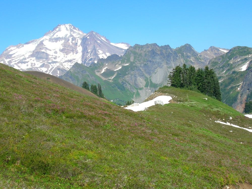 Climbing straight up the hillside, we soon came to the hikers trail heading up and over the ridge. Immediately the trail dropped 300 ft. fairly quickly. It then crossed the upper part of a large basin. On the other side of the basin, the trail then climbed, very steeply, up and over a ridge. This is the trail that Jeff had considered when we came in and, per the rangers, seemed to be the way many climbers took. The last 75 to 100 vertical feet prior to gaining the ridge, was the steepest trail I’ve ever been on. One slip here and it was hundreds of feet down of heather and talus. Footing was not very good with loose small rock and dirt and there were no rock or other handholds to help. I was thankful that Jeff let me use his hiking poles. Going the other way, I really don’t know how one would go down this part with a full pack on. I would have to remove my pack and lower it via rope before descending and even then, I would want to have been roped up, anchored from above.