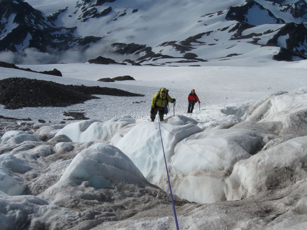 In a short time we were up to the top of the ridge where two glaciers met. Crossing the crevasse field wasn’t too bad; there were “bridges” between or over the crevasses. However, one had to be careful so you didn’t slip. When crossing, the rope to the other climbers was kept relatively taunt, not tight enough to impede your progress, but tight enough such that if you did slip or fall, you wouldn’t go very far. No one fell and the crossing was made without incident.