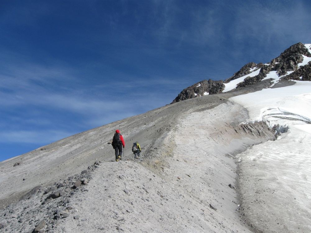 We were now on the Cool Glacier. The slope was getting steeper as we approached the pumice ridge that we will have to climb. The pumice ridge will lead us to the base of the last pitch below the summit. The ridge was rocky, mostly loose sand and small rock type material, we kept our crampons on as the pumice was so loose you would take a step and then slide back half a step. The crampons helped retain some traction. This was a long haul, about a 400 ft. elevation gain. Once at the top of the ridge, we took a break. From here we could easily watch two climbers starting up the ridge below us. We had seen them off and on for most of the day. When we left our campsite in the early morning, we could see their lights way below us.
