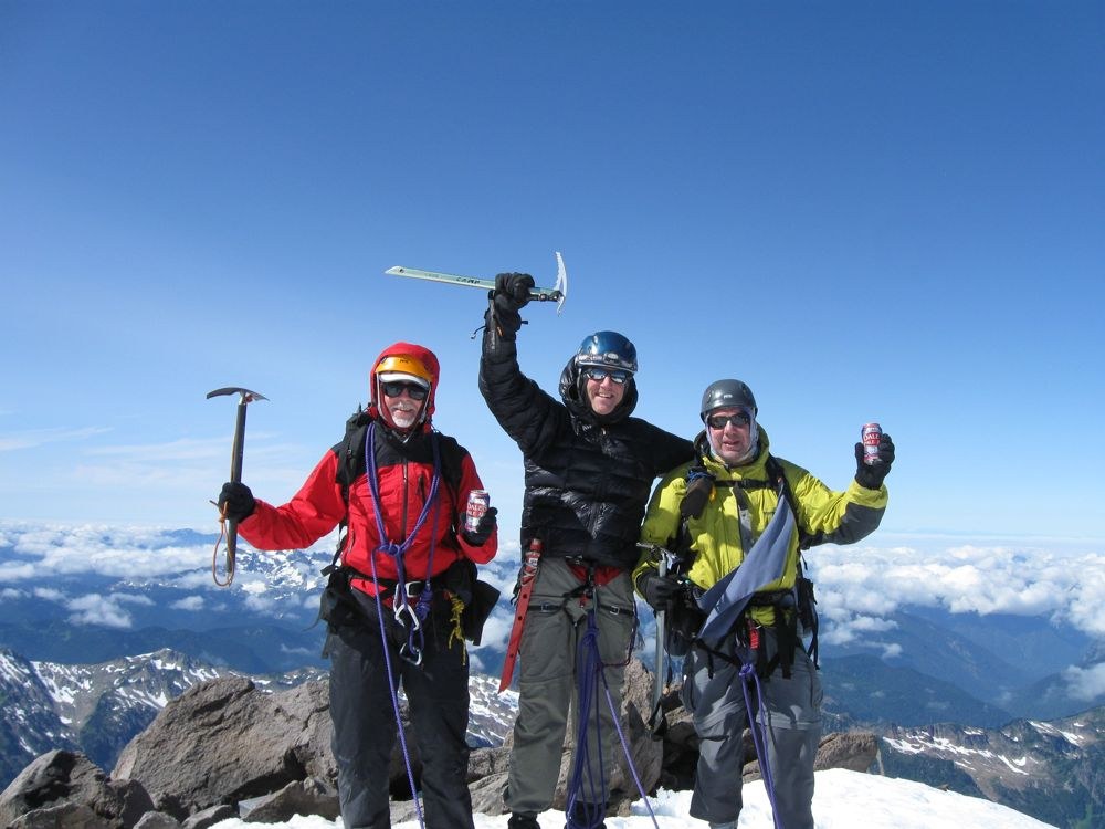 After a short break, we traversed across the bottom of the last snowfield that would lead us to the summit. Going up that last pitch was slow as it was fairly steep. What helped was that there were many steps from other climbers so you did not have to make your own steps. This was about a 300 ft. or so elevation gain. We reached the summit at 10:50 AM, close to a six hour climb. We took several pictures and broke out the beer. Carrying a beer to the summit of the mountain has become kind of a “thing” with us. Usually we drink it at the top but today we decided not to and keep it for lunch lower down.