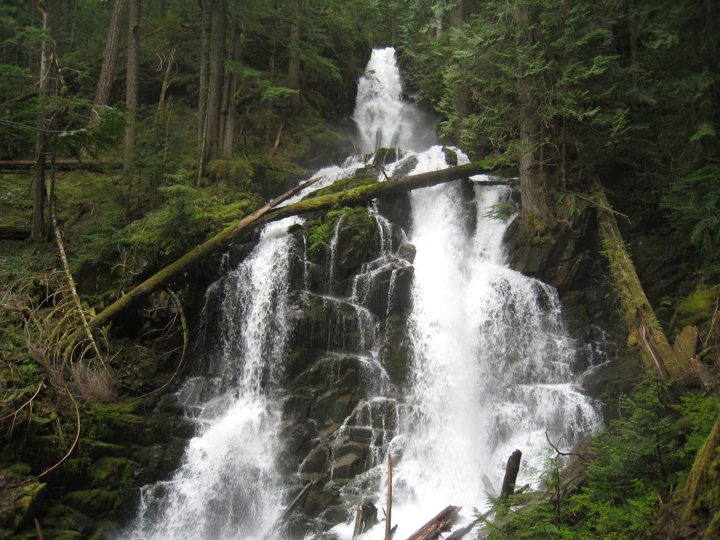 The first mile is to Ranger Falls, up a series of switchbacks. There are a few trees to duck under, but nothing low. Plenty of muddy spots, though. Easy enough to get up; going down was a bit trickier, and I slipped a few times (and almost fell once, which would have led to about a forty foot roll down a switchback -- fun!). Having a walking stick was a real good thing. Once you get to the falls, there's a bit of water on the trail, but the falls were going full-blast with a wonderfully cool mist at the very-close viewpoint.