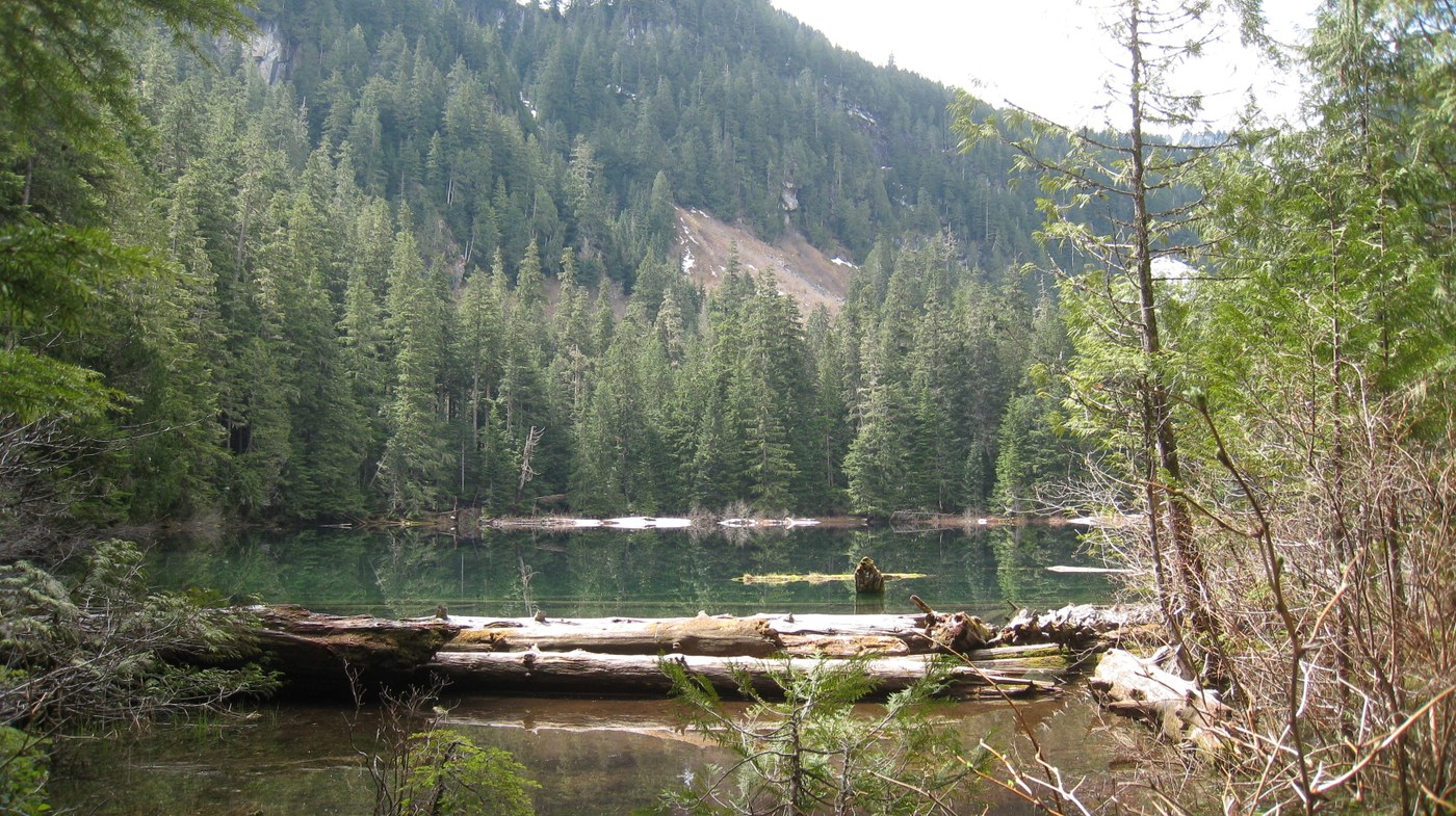 The remaining 8/10 of a mile from the falls to the lake continue upward. Again, more mud (with a few easily navigable patches of snow holding out), but sadly, most of the wildflowers had come and gone, so there was lots of lush green but little else in the way of color. Then, the lake. Flat calm to the point where the mountains above reflected off the surface of the water, it was beautiful, and a nice place to rest.