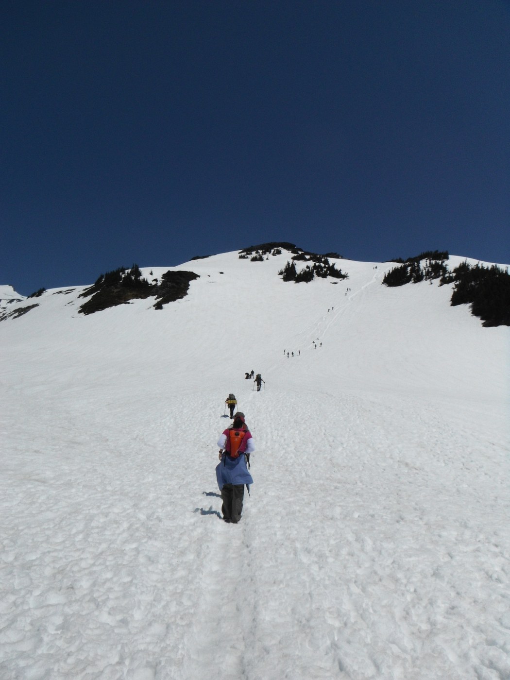 I turned around at Panorama point because I was only wearing a pair of waterproofed trail runners and would have liked more traction to continue to Camp Muir. There is a pretty established glissade route down from Panorama point to the level area below, which shaves off quite a bit of time on the descent. I was very grateful for my gaiters!