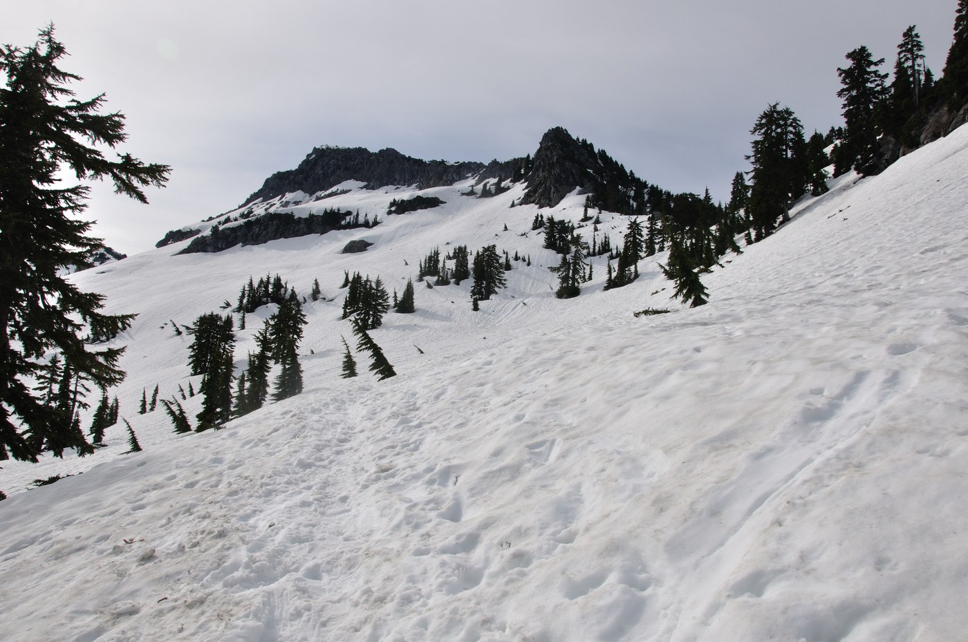 Patches of snow and mud for first 1.5 miles, then snow the rest of the way. A few steep snow sections warrants two trekking poles. Soft snow in the AM may become very soft in the afternoon...gaiters recommended. Follow the obvious snow trench to the summit.