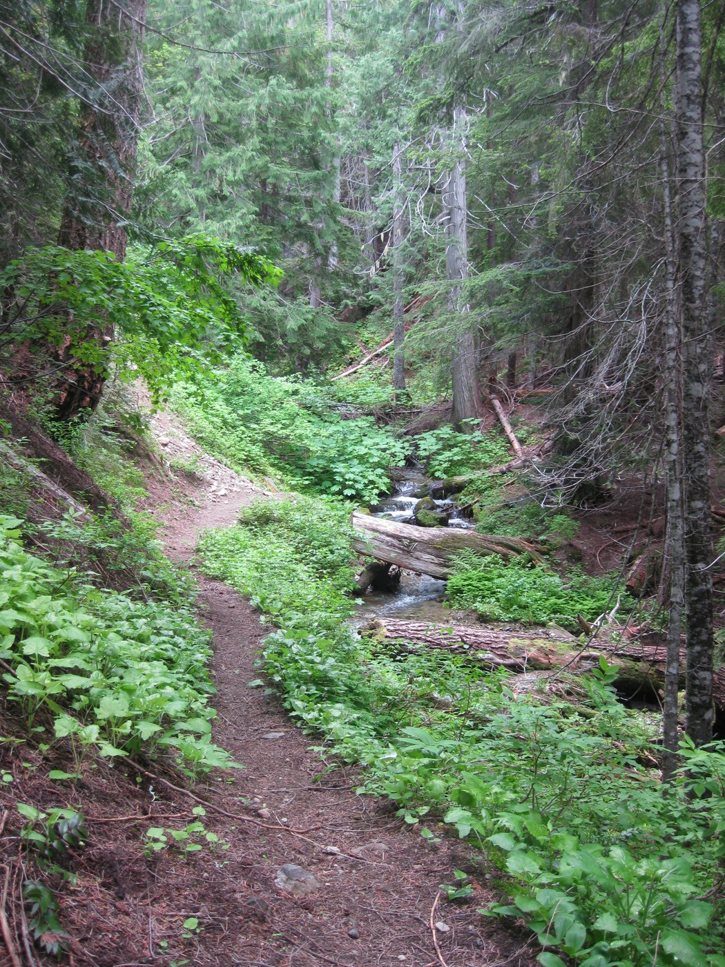 This is a long forest hike on a trail hung on the side of the creek canyon. We got out ahead of the rainy weather, but it caught up to us about 3 miles in. The lower trail is in mostly good condition, the USFS has been working on the trail. Past 3 miles the trail is heavily trenched and eroded in places and there are numerous blowdowns, some easy, some hard to get around.There is a massive pile of avalanche debris (snow, branches and stacks of entire trees) at the creek crossing at about 4 miles. The crossing can be made safely, but requires some route finding to relocate the trail on the other side (coming and going). After puddle splashing in the rain to the first ford at 6.5 miles and getting totally soaked in the overgrown sections, we camped in the forest near the ford. The creek was running too high to wade, so we day hiked cross country about a mile through mostly open forest on Sunday to Rock Creek Meadows and on above to the next meadow opening where we turned around. Above the meadow there are snow patches on the trail in the forested sections. The main meadow is about a week away from full flowering. With all the blowdown, big avi pile,muddy spots and the high creek levels this hike is not an easy straightforward walk yet.