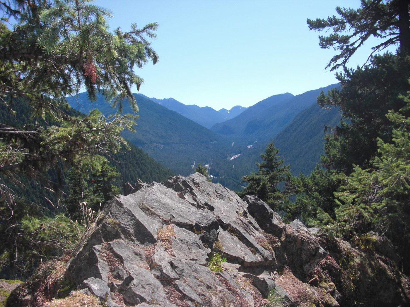 Once you are on the main trail it’s well defined and easy to follow. It parallels the road for a short distance then follows the creek for a half mile or so before turning sharply to the left at a trail junction sign. From here a series of well graded switchbacks will take you to the top of the ridge. A short side trail to the left takes you out to the peak. The views of Rainier and the White River valley are good but partially blocked by trees. If you scramble to the top of the rock peak views are no better and there is no good place to sit. There is a flat exposed point below the rock peak that looked like it might afford unobstructed views but you can only reach this by risking life and limb on the steep approaches on either side of the peak. We didn’t go to the point.