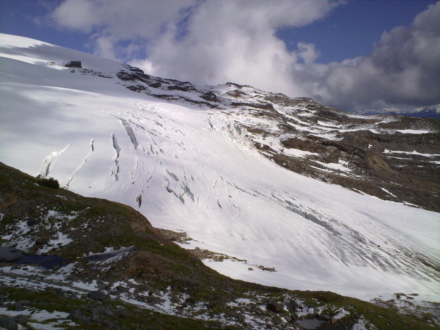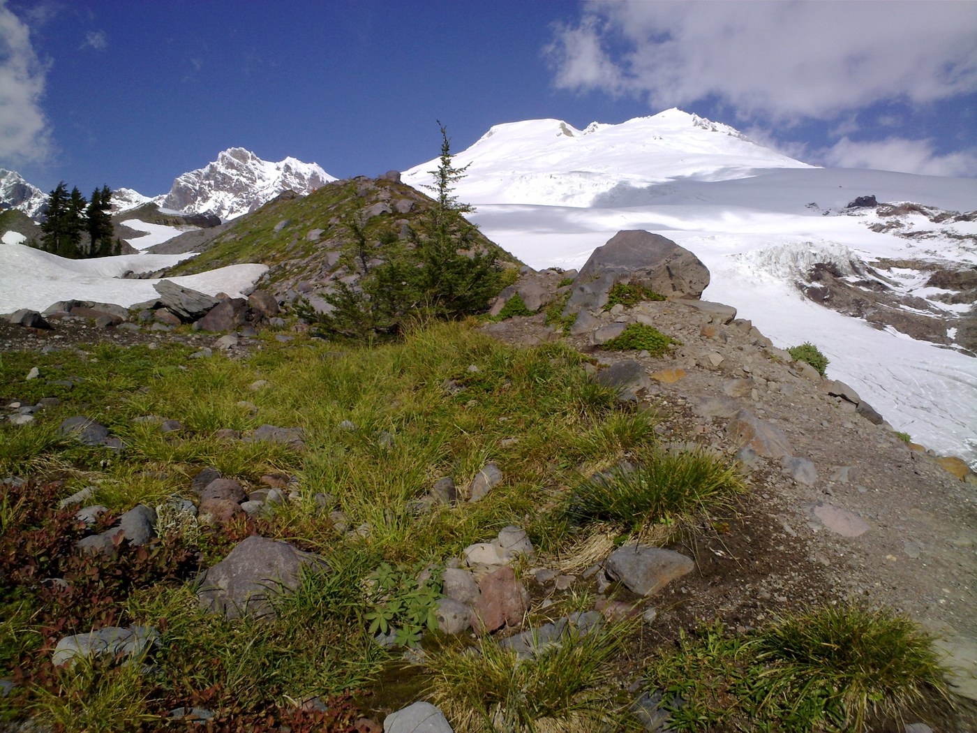 We enjoyed a glorious clear day at Mt. Baker on Sunday. The mountain positively gleamed in its coat of new snow. In contrast, the meadows around the Railroad Grade were still green, and there was no snow on the trail almost all the way to the climber's bivouac camp. Get out to this area while the good weather lasts!
