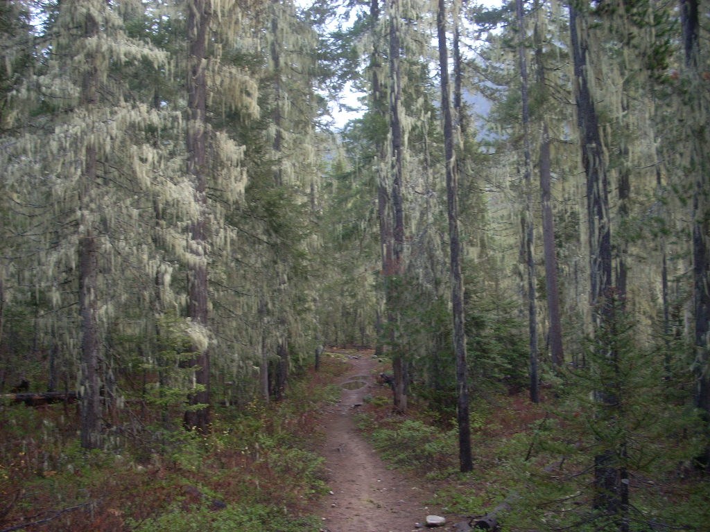 The Icicle Road is open! The long unvisited Icicle Creek trail is in super condition and dripping with lichens as far as the French Ridge junction. The French Ridge trail is in excellent condition, not as steep as some in the area-- I'm looking at you Blackjack Ridge-- though the snow was a dusting at the 5000' mark and increased to maybe 3-4" out on the open ridge. The brush across the trail required constant whacking to knock off the snow and there's one blow down too spoketastic to climb over or get around-- I shimmied under on my belly six or eight feet. The views form the old lookout site were intermittent owing to foggy clouds, and I lost the trail in a snow basin on my way down, wound up heading uphill toward Turquoise Lake. The backdoor trail is really brushy, and the French Creek return leg has a bunch of big downed trees to clamber over.