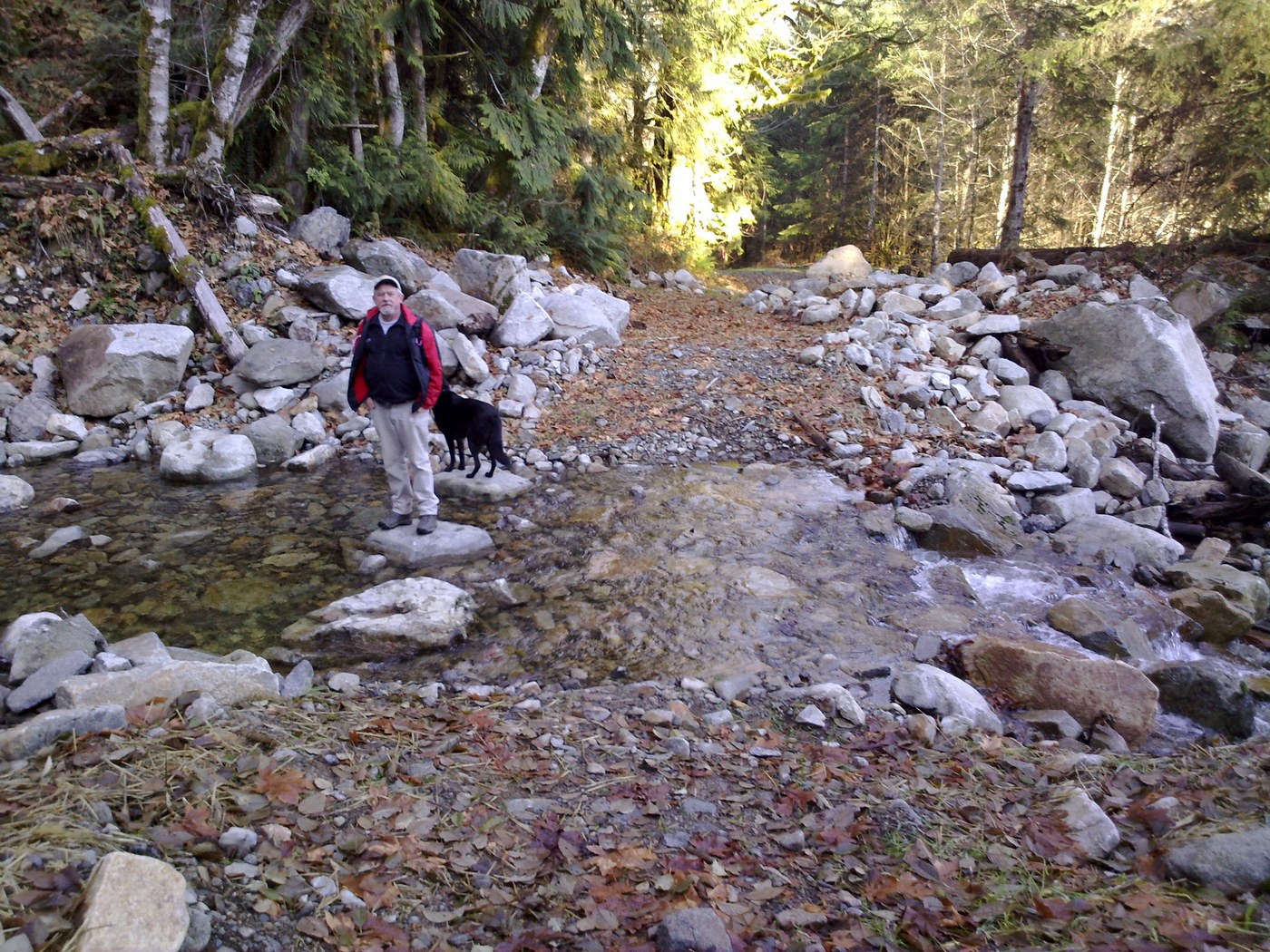 The CCC Road Trail is a great low elevation hike in the Middle Fork Snoqualmie River area, especially now that recent improvements were made to the trail. Using national "stimulus" money, the Forest Served reworked much of the old road to make it more natural and interesting to hike on. Most notably, culverts were removed, replaced by fords in many spots. Handy stepping stones help out with crossing the larger streams. The road/ trail climbs high on the sunny side of the valley, nice on a clear December day. There's a lot to see on the CCC trail. Peek-a-boo vistas are frequent and give views of high snowy peaks such as the Russian Buttes. Mossy cliffs and tumbling creeks abound.
