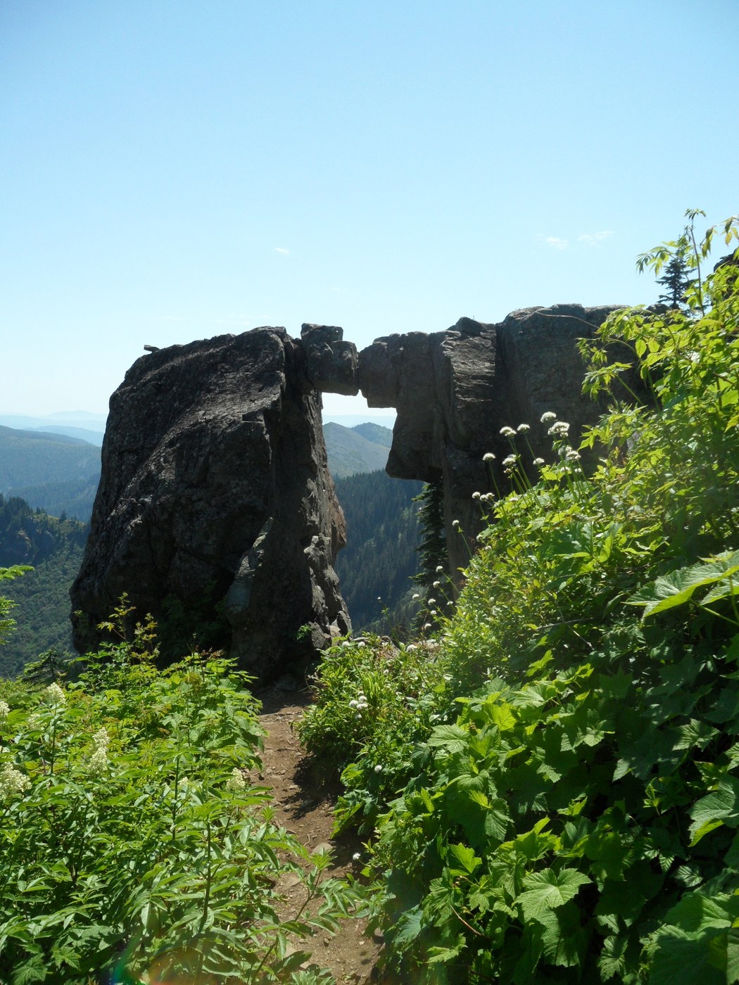 I started this hike from the trail that starts from the trailhead left of the parking lot. The trail is split in two, but they both come together in about 1/2 mile, so it doesnt matter which one you take. About a mile from the parking lot is a sign indicating that you are on Ed's trail. The views and the wildflowers are incredible the whole way. As other trip reports mention, along the hike you'll walk through and arch and then get to a rock scramble. The trail continues around, showing off views of Hood, Adams, St, Helens, and in the distance, Rainier, and more wildflowers than you can imagine.
