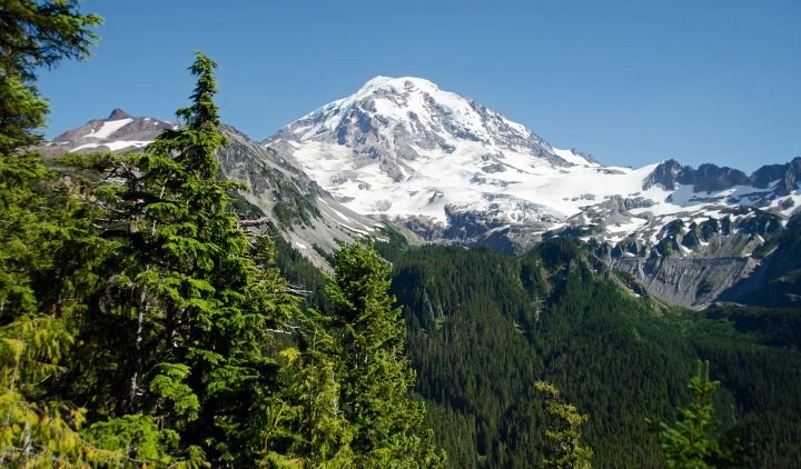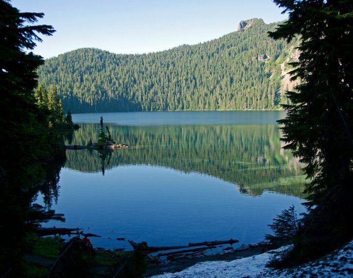 Our hiking party left Spanaway at 8am and we arrived at the Mowich Lake campground just before 10am. The camp wasn't crowded with campers, but the parking stretched quite a ways along the road. The day turned out to be a great day for hiking---sunny, clear skies and a nice cool temp at the start of our hike.