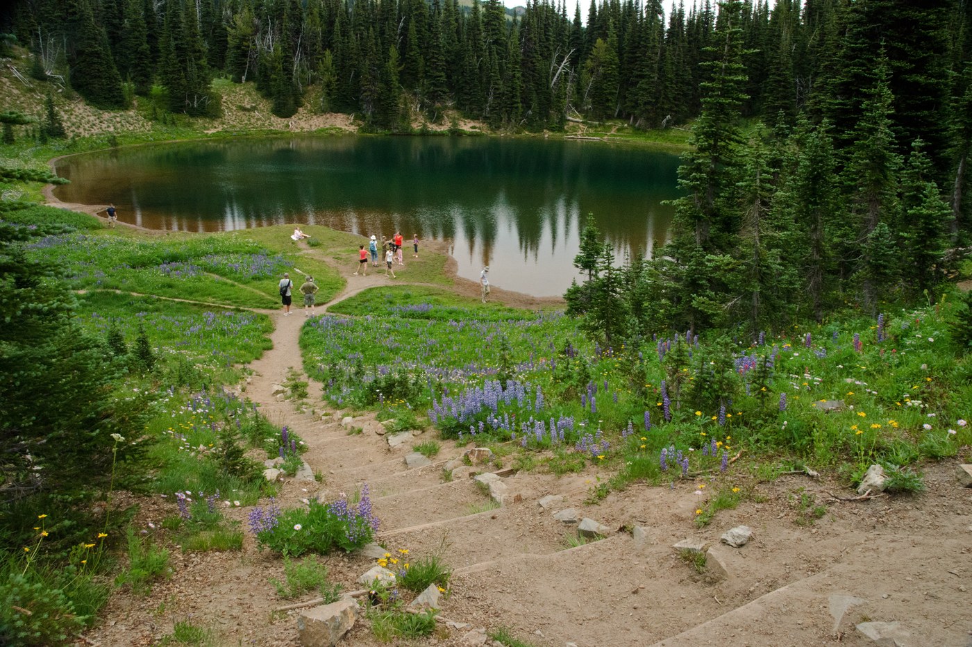 Heading back towards First Burroughs, we decided to do the loop back to the Sunrise parking lot. This part of the hike is out in the open---there are no trees for shade---so make sure you have plenty of water. Also, sunscreen and bug spray---I was lathered in both---are a must! This hike is quite dusty too. Shadow Lake was a nice relaxing little break. Again, lots of wildflowers here. Past the lake is a nice lookout area, called Glacier Overlook. The remainder of the hike from here, you walk are walking through a forest area so the shade was a nice welcome. Once down by Sunrise Camp, the meadows are just overflowing with colorful wildflowers. It is so beautiful.