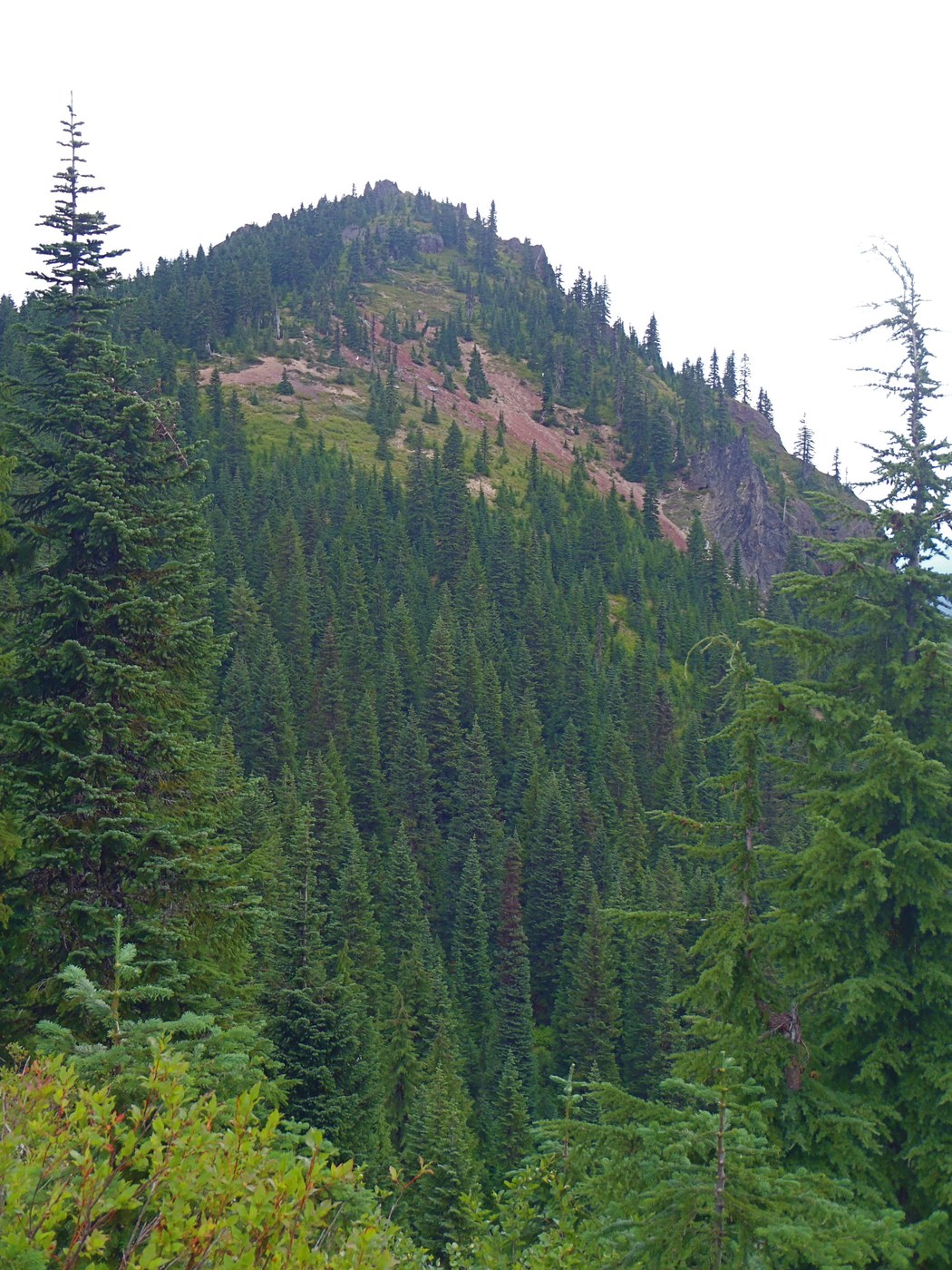 Once you have crested, the trail traverses the Western slope just below the summit offering good views of St Helens. The trail is in need of maintenance but there are no major obstacles.