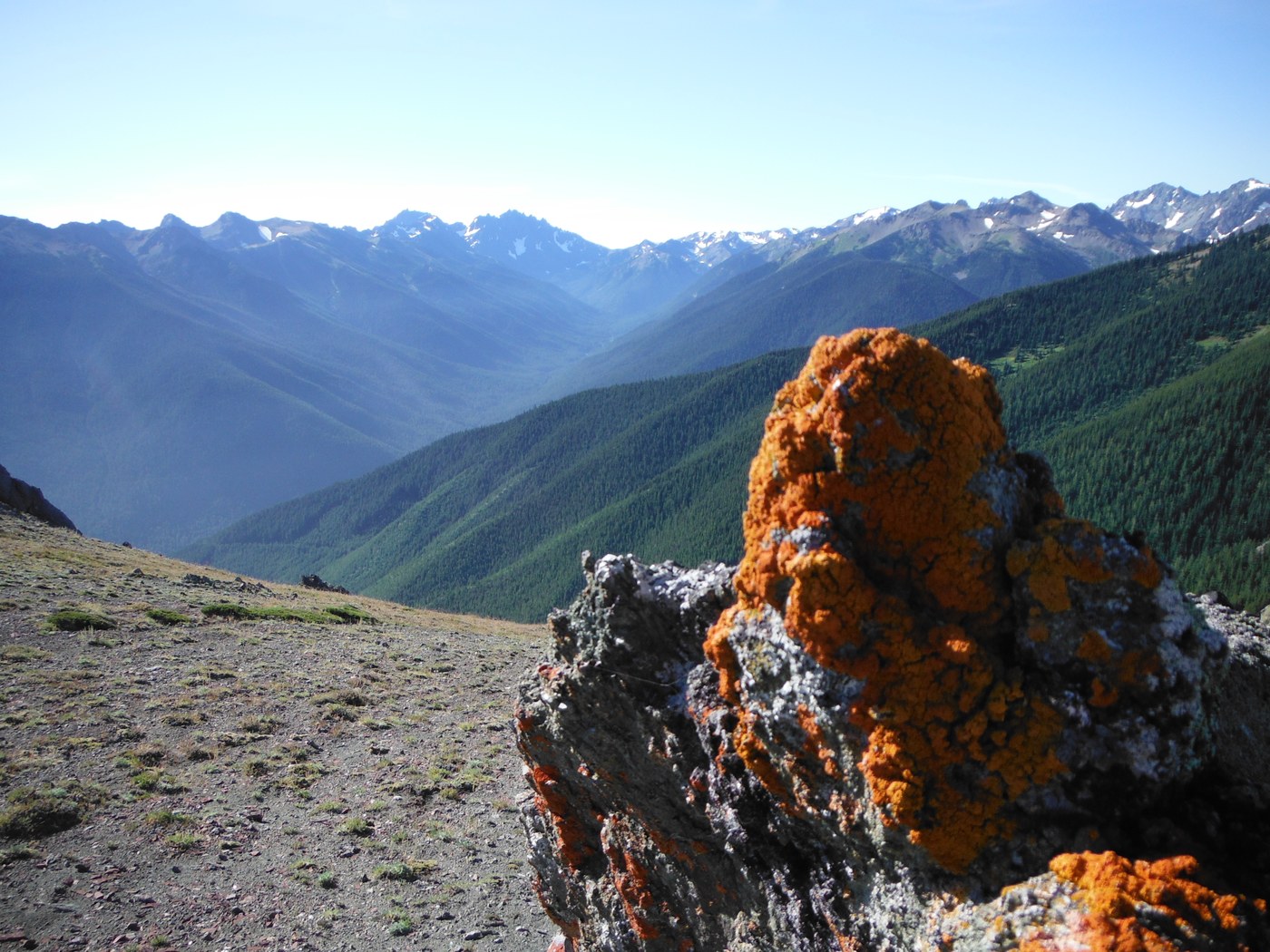 We retraced our steps and continued along the Western ridge, past several different types of volcanic rock before turning south toward Baldy. There is no clear trail between Tyler Peak and Gray Wolf Peak, just a faint bootpath that often dissapears for long stretches. The path goes all the way to a 6530' peak before turning West toward Baldy, and the going is easy enough to be worth the extra elevation gain. From here it's a simple walk to Baldy's summit which offers a splendid view of dozens of surrounding peaks including Mt Olympus to the SW and Mt Angeles to the NW, as well as Mt Townsend and Mt Mystery to the SE. I met 3 girls from Port Angeles who were scouting for a nearby tarn on their map. We needed to head back soon for a family reunion, but Gray Wolf Peak just over a mile to the south looked far too tempting to pass up, so I watered the dogs and took a few quick pics then hurried down the mountainside.