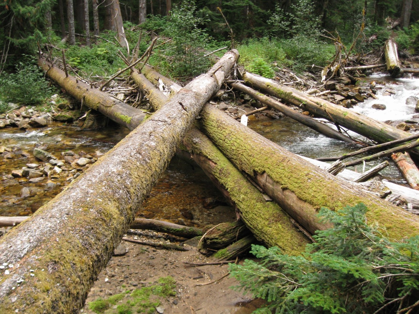8:30 Pilot Ridge Trail, N. Fork Sauk crossing. Sawed a few knobs off the log, couldn't get them all. There are several good, wide, level crossing logs. They might be intimidating to some people, esp. at high water. The corgi did not hesitate. A pole with a sharp point might be useful if you find this spooky. The big log in the 2nd photo has no knobs, easily shinnied, easy to get around the root ball at right.