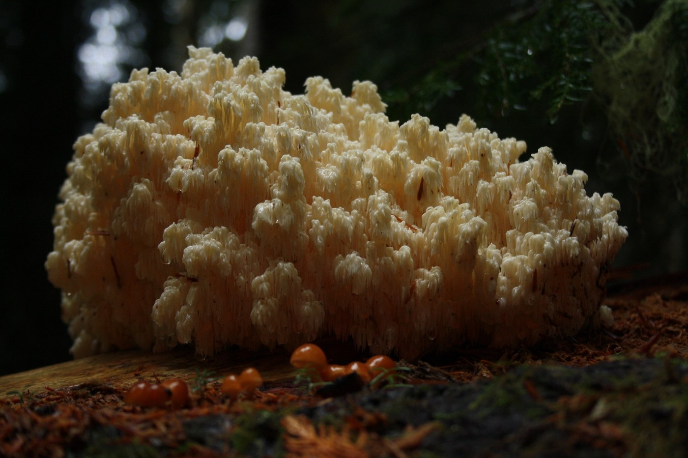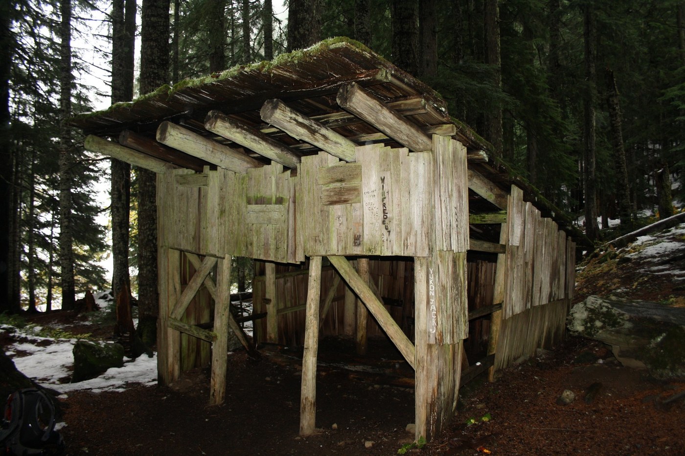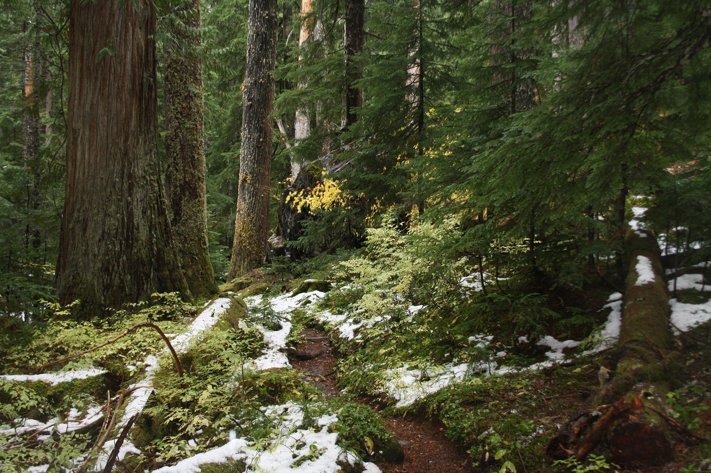 Once on the trail it showered off and on all day. The trees did a great job of sheltering me from the worst of it but the forest canopy was drippy. On the way back it was actually dry most the time until the last mile when the first real rain of the day hit. The trail quickly enters the Glacier Peak Wilderness (sign was missing, was there the previous trip) and was clear and easy to follow the whole way. There is one big blowdown earlier in the hike but it can be walked around fairly easy. There's water on the trail in places from the recent rains and a few small creeks to cross on the length of trail I did. Snow hugged the trail in patches the whole day but started covering parts of the trail after crossing a bridge at the camp 3.5 miles up. It never presented a problem but is a reminder of the shorter days ahead and that winter is coming. The trail rolled through the forest climbing few times while coming and going from the river bank. Along the way moss was the theme along with fading fall colors, snow, strange large fungi and mushrooms.