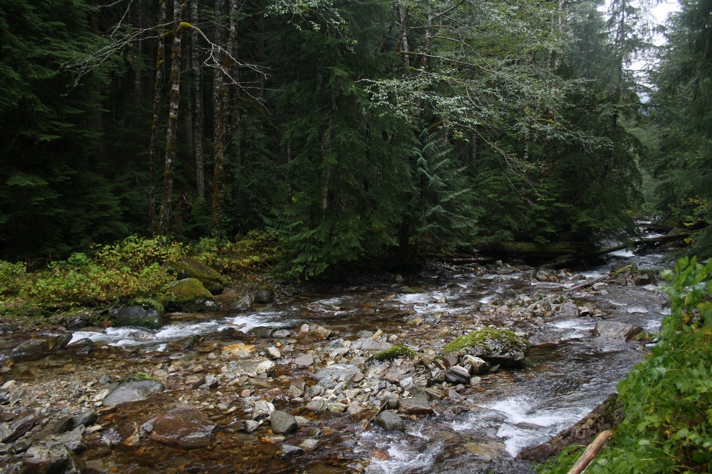 It was dark and dreary and threatened to shower all day but I hadn't been out in 3 weeks was was getting cabin fever so I went with a river trail. I had been up this green, mossy, fungus and mushroom covered trail once before but only went 3.5 miles up to a camp by a creek. This time my goal was 5 miles up to the Mackinaw Shelter, the camp before the trail starts to really climb. I got to the trail from the Barlow Pass side of Mtn Loop Hwy, there was snow on the sides of the road at the pass but nothing on the road. The gravel road after the pass was rough in places with potholes but nothing serious all the way past Bedal to the FSR #49 turnoff. FSR #49 was in a little better shape than the main road but was still bumpy in places. I arrived at the trail head and I was the only one there as it would remain for the day.