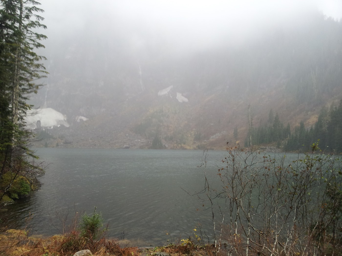 Even though we missed the snow, the view of the lake was gorgeous! I haven’t been up to that lake since the boardwalks around to the left of the lake were constructed, and it made for a pleasant stroll with great views. The waterfalls on the opposite side of the lake were huge from the heavy downpour. We stopped for lunch and cooked up some hot apple cider, which was a delicious way to stay warm since most of our rain gear was saturated.