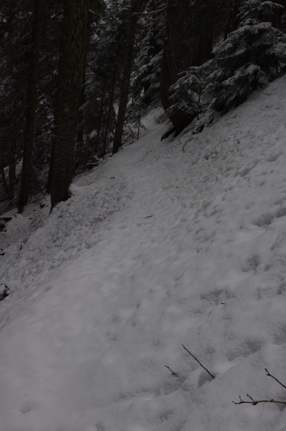 The snow increased in depth from ⅛ of an inch to about 1 ½ feet the further up I went. The snow was powdery but wet, with a crust formed on top. After 1 mile, there is a fallen tree 2 feet in diameter across the trail. Going over it, in snow, was a pain. I recommend trying to find a way around until it gets cleared.