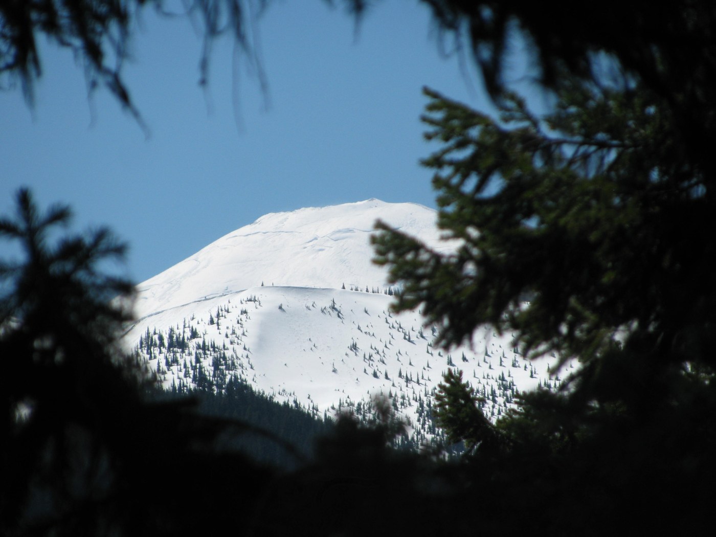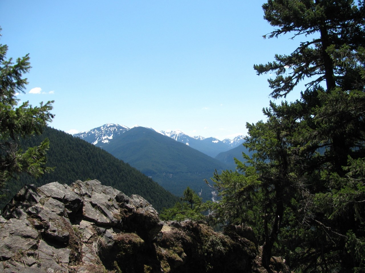 With the beautiful weather we chose this hike hoping to cash in on some great views of Mt. Rainier. However, that didn't work out -- from the trail at least. The trail was snow free to the viewpoint 3 miles in. We didn't even see the sign for the short trail off to the left until our way back down. From the trail heads inland toward the Dalles Ridge trail. Sign said three miles. We hiked about 2 miles toward that junction but turned around after hitting snow around 4,700 feet. The viewpoint had good views of the valley but Mt. Rainier was MIA. Perhaps you could see the very top of Mt. Rainier but it was hard to make out (see photo below). But we didn't leave empty handed. After the hike we continued on 410 for about 10 miles where we got gorgeous view of the mountain from inside the park boundary.