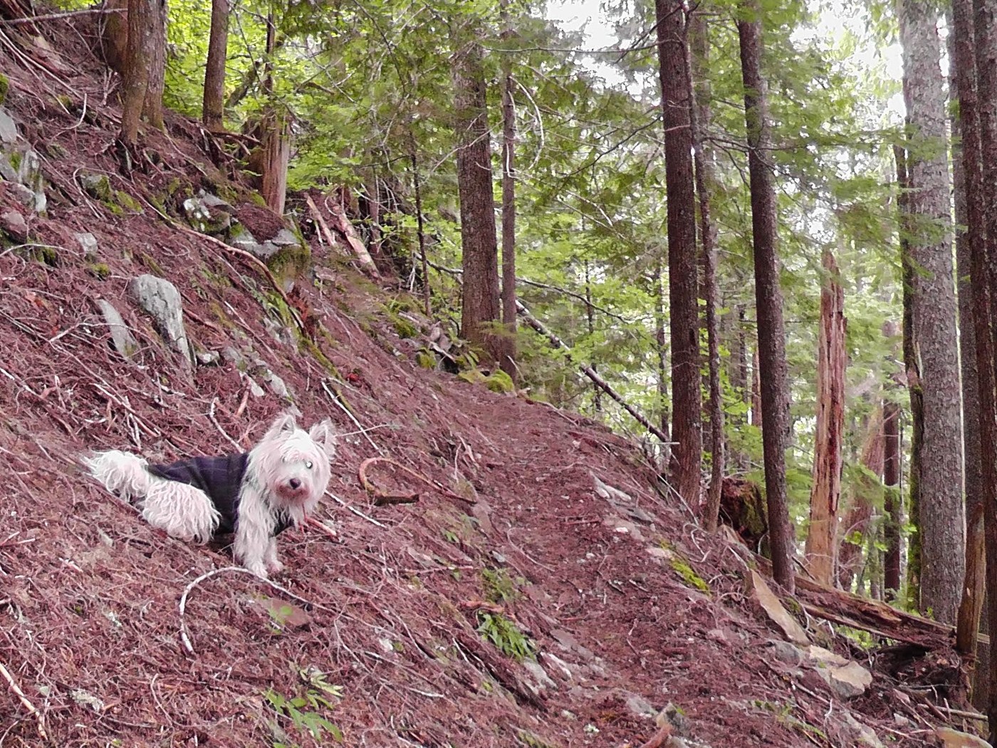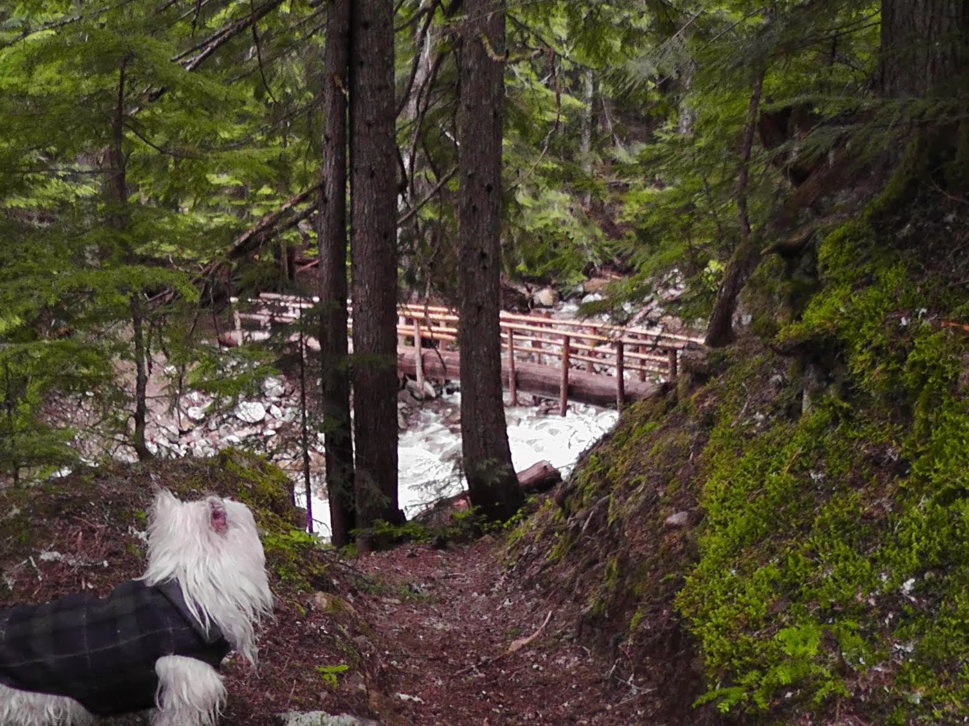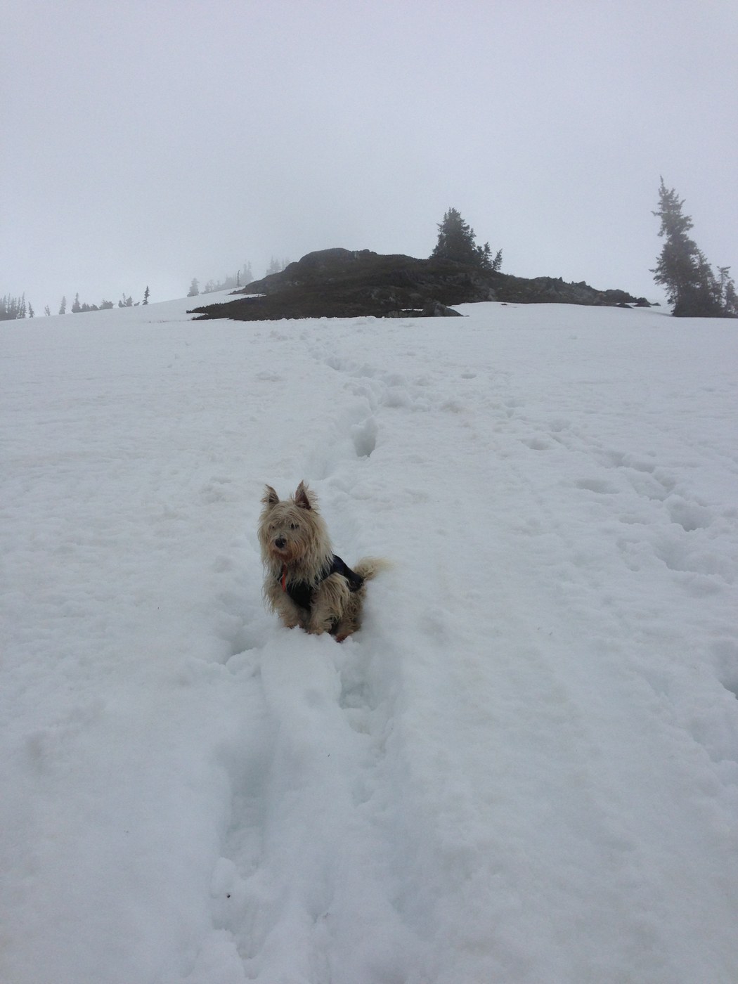 We made it up to the elevation of the Pacific Crest Trail, but it was buried under approx. two feet of snow, there were white-out conditions, and I had stepped out of one of my crampons somewhere below, plus the dog was tired. So we turned back to camp at lower elevations. Found the crampon on the way bock down, and camped along the trail around mile 4.0. Noting the trailhead warning to hunters to make sure you don't shoot a grizzly by mistake (!), I cooked/ate well away from camp, and hung the bear bag using the PCT method and observing the proper distances from the trunk, branch, and ground.