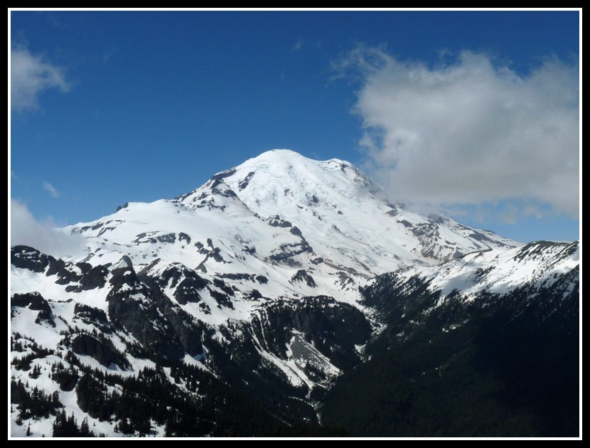 Once off snow it was a short rock and dirt trail hike to the top. The views are outstanding. Well worth the 1700 feet of climbed in 1.2 miles from the lakes. Memories fade over 13 years. I forgot that there is another slightly higher summit a short way down the ridge. We had to go take a look. We dropped down to the ridge and around the left side of the big rock block. There was a faint trail. Around the other side we found a short rock scramble to the top. As I was taking photos I suddenly realized that Rainier was totally out of the clouds. Our patience was rewarded. A short way down the ridge was another summit that looked to be a little higher. We dropped down along the ridge and again found a route to the left. This one led to an easy walk up to the highest point. Only room for one person at the 6790' peak but lots of room just below. We had very clear views of Goat Island Mountain, the road to Sunrise, and a little of Burroughs Mountain. Rainier was going in and out of the clouds as it did for the rest of our stay.