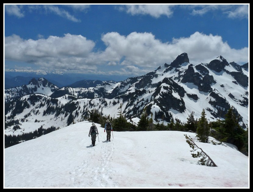 Gary and I did a snow scramble up Tamanos Mountain back in 2000. That was before my website. I did not take a film camera along. It was a beautiful sunny day and I regretted not having any photos. Thirteen years later it was time to rectify my mistake. John joined us for this trip. I was out the door at 6:00 am and picked up Gary and John in Kent. We headed out Highway 410 to the White River entrance to Mt. Rainier National Park. The forecast was for all day sunshine... when I went to bed. In the morning it had changed to "mostly cloudy". It was very cloudy in Seattle but there was some clearing at the trailhead. We were the only car in the lot at 8:00 am. I was a little surprised to see a park trails update that said the first two miles were snow free. There was no snow at the 3750' trailhead. There are some downed trees across the trail. Most of them are in the first quarter mile.