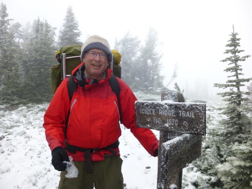 In the morning, we continued on to the junction with the Fourth of July Tr 1579, and as we ascended to and along the top of the ridge, the snow had stuck to trees, grasses and snow patches, but little stuck on the bare ground. We descended to the Icicle Road as the day warmed, the clouds thinned and then later turned to drizzle in late afternoon. A mile above the road, a 30" rattlesnake lay coiled in the trail, sluggish in the cool temperatures, and not in a hurry to leave the tread. Good workout, and good shakedown for what's next. Passed no one from road to road.