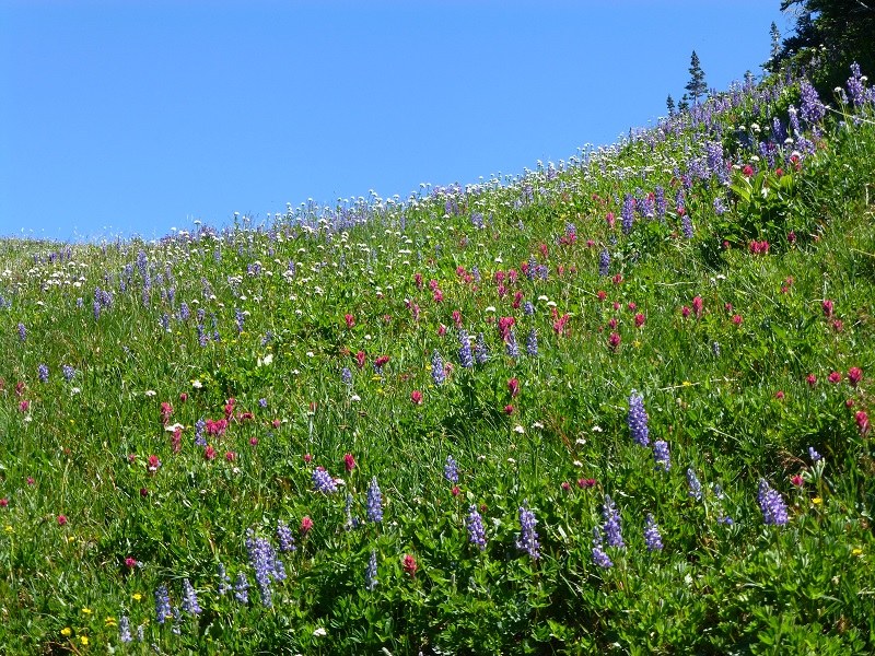 Beautiful day for a trip to Sunrise! Took about 2 hours from the Bellevue area to reach Sunrise. Decided to hike up to Sourdough Ridge, totally worth the little extra effort to walk up a meadow of wildflowers to see amazing views at the ridge. Views included Mount Rainier, Mount Baker, Glacier Peak, Suntop Lookout and tons of other peaks. Casually hiked over to Berkeley Park...a few small snow fields to cross...no traction devices needed. The Park is blooming right now...found a flat rock to sit and enjoy views over the park including Mount Baker.