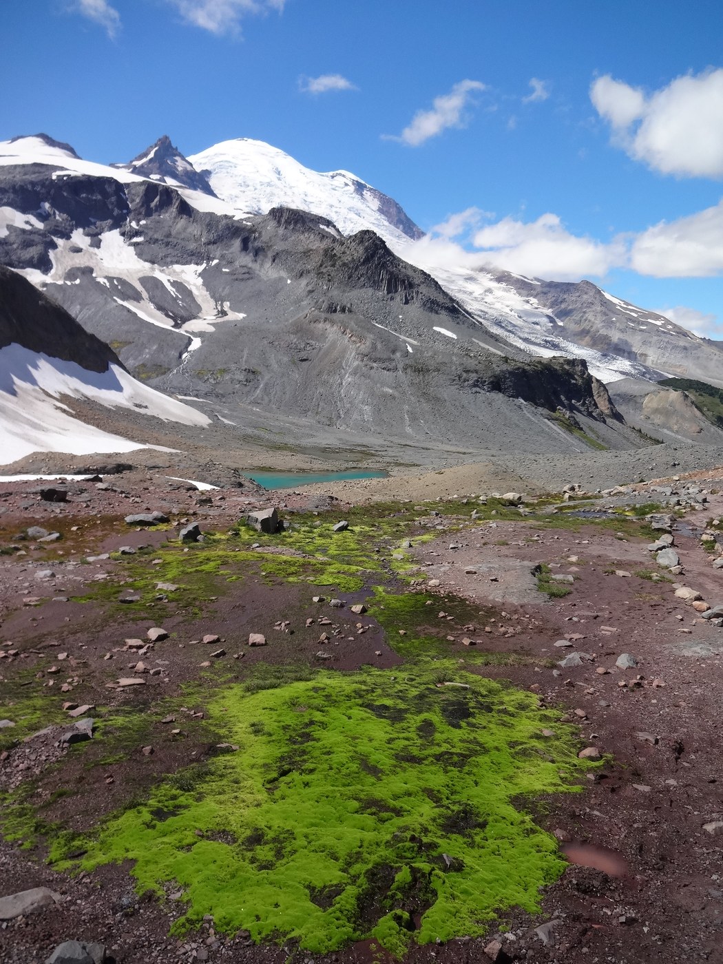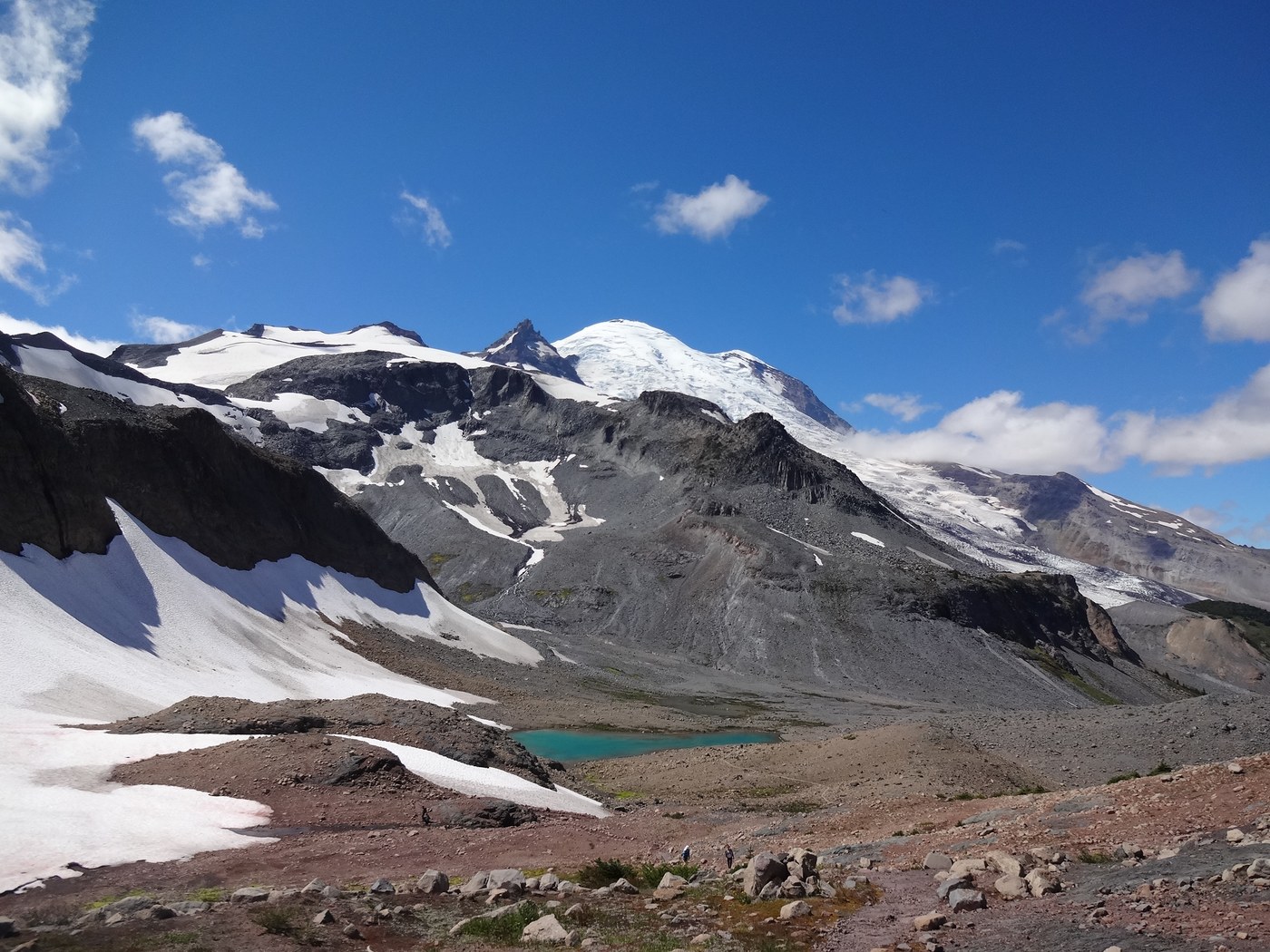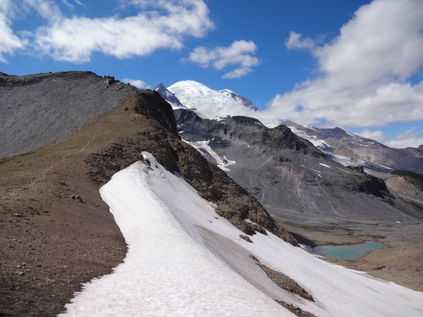The clouds held off long enough today for me to make up to the Gap with views the whole way. If you are planning a hike to Summerland, I highly recommend continuing on to Panhandle Gap if you have the time and energy. Once out of Summerland, you leave the vegetation zone and enter a moonscape. There are rivers, cascades, tarns, and beautiful views of the mountain and Emmons Glacier. Then from Panhandle Gap, you can see south to Adams and Hood. The extra two miles is totally worth it!