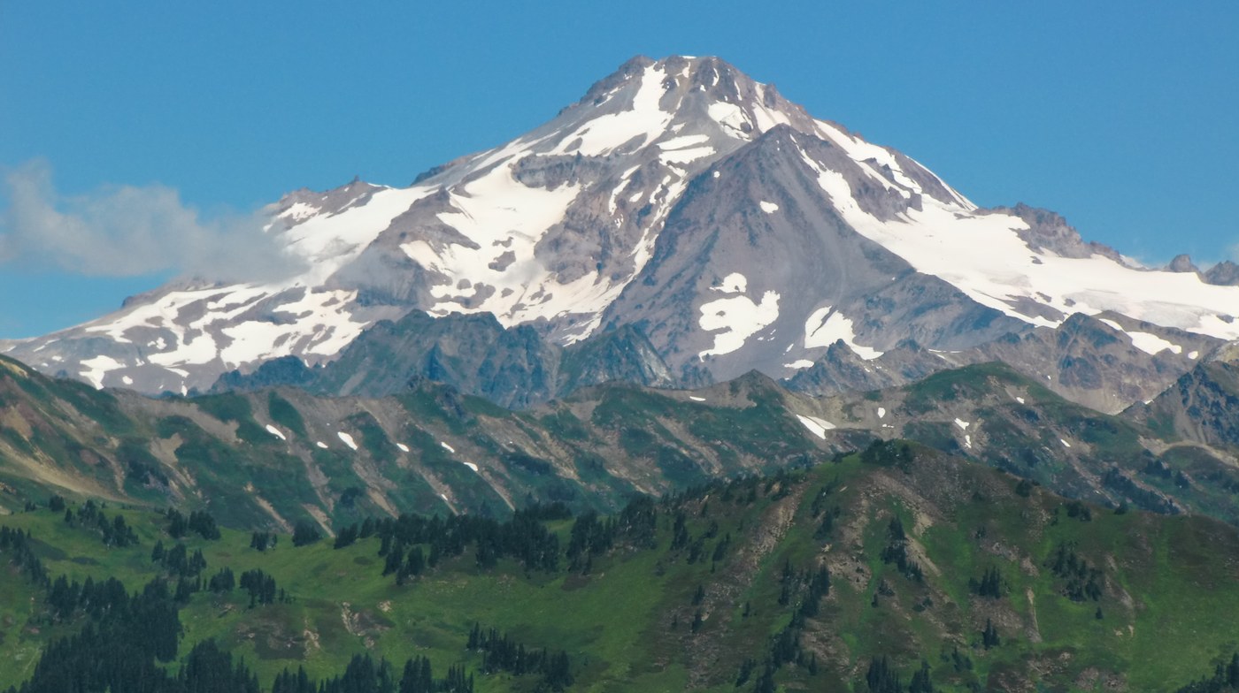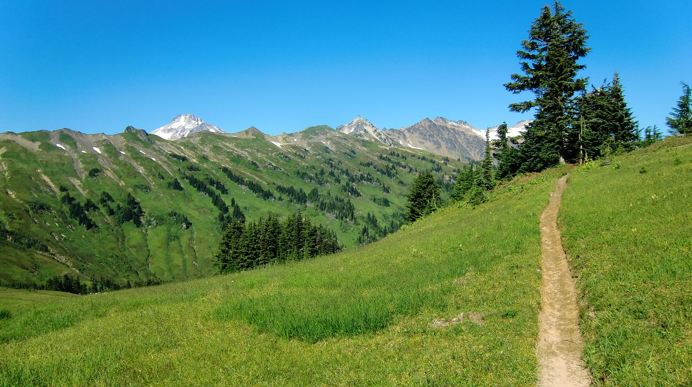 Took the Pilot Ridge Trail which required an easy ford across the Sauk(There was a large wide blowdown across the river). I took this route because it is less exposed and get the major elevation gain done early, not knowing how many elevation gains and losses there were going to be on this hike. The Pilot Ridge trail has not been cleared, but the blowdowns were easy to get around and after breaking out of the trees on the ridgeline there were some brushy areas when it entered the trees again. After an elevation loss and gain on the ridge the trail breaks out into some spectacular meadows with awesome views and some of the first great views of Glacier Peak.