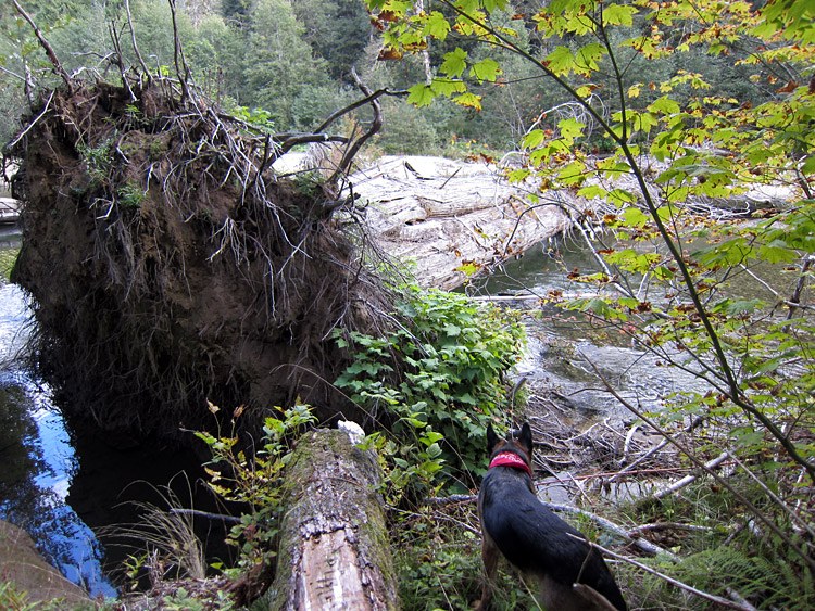 The Harold Engles Memorial Cedars trailhead is a little over 3 miles up the road on the right side. Just a sign at the side of the road. A couple of short loops here to wander around the woods. When you come to the Big Giant Cedar -- you'll know it when you see it -- the trail splits: left eventually dead-ended into brush, but was worth wandering around and passes the giant fallen cedar over the river; going right will take you to the cathedral-like ring of giant cedars. Beautiful! All kinds of mushrooms to be seen right now, adding to the woodsy fun.