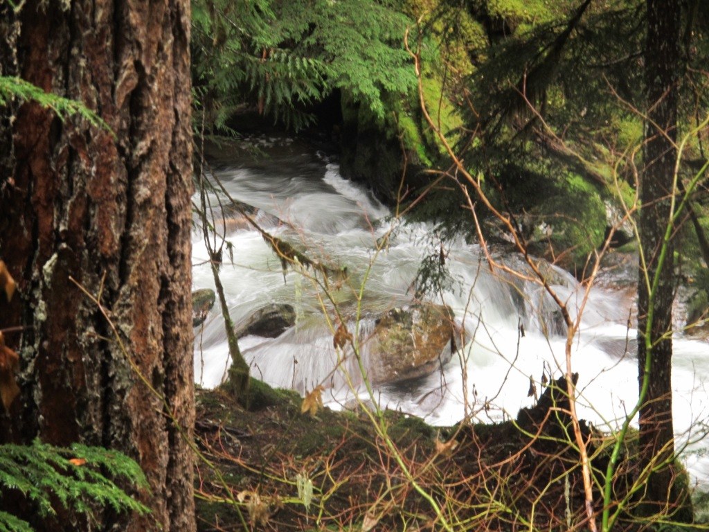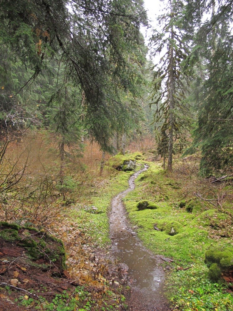 There is more fun to be had on this hike when it's done in the rain! Stomp thru the mud, then splash thru the puddles, try and splash your hiking partner (wait, maybe not, if they have the car keys). Then shuffle thru the big maple leaves and hug the big old growth trees. The trail is in great shape wide and well built, but this IS the Cascades, expect water, lots of water on the trail. We hiked about 4 miles in, to a nice sturdy bridge, but I don't think it is the one over Red Creek,as the creek was pretty puny. There were no real issues at all. The road going in is good, although there is a stream crossing the trail about a quarter of a mile away from the TH, so if it is too deep for you to safely drive over it with your car, just park and walk the rest of the way. We found the loo unlocked, with plenty of TP. Although we hiked in steady rain, the windstorm had not hit (yet). Of course, we saw no one until we passed 3 trucks going in as we were driving out. We got an early start and were back home in Everett by 4.