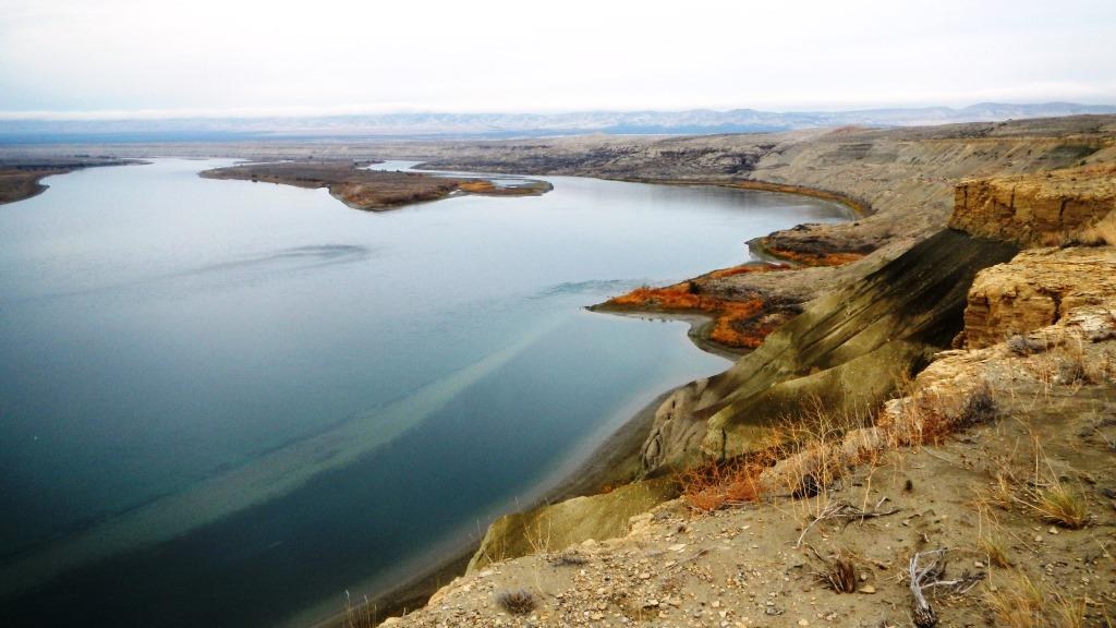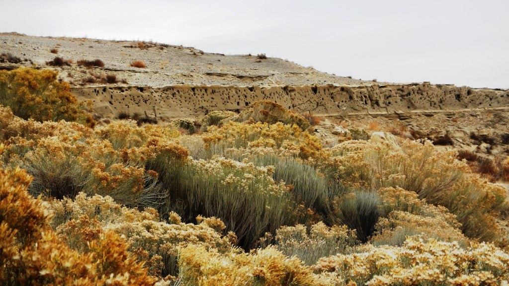 We had lunch on a lower landslide bench nestled in a large patch of fall-blooming wind-guarding rabbit brush. Orange-colored tumbleweeds were caught in the back slopes of the landslides, as the high winds surely would have blown them far away otherwise. We saw evidence of the Missoula Floods in the form of erratics tossed about here and there. Coyote and deer tracks were numerous, and we spotted ducks and geese/swans, crows, chukkars, and hawks.