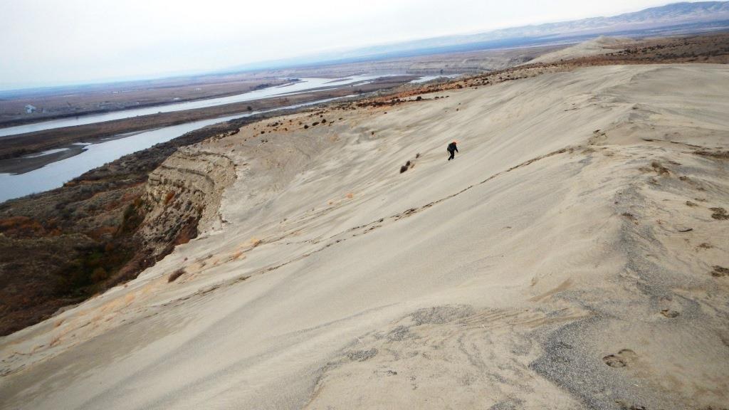 After we climbed the dunes, we as “loopers” decided to take the Columbia shoreline back. Climbing down through layers of sandstone we oohed and ahhed at the swirls and layers of sandstone and siltstone, which varied from shades of pink to green and yellow, but predominantly white. We speculated that this sand was deposited by the ancestral Columbia as it meandered through a flat basin many many years ago. Later on, we discovered concretions of this silt and sandstone on the beach (some folks call them “sand babies”). These are crazy fun layered globular cemented sand and silt grains, which form as groundwater seeps through the layers, causing the grains to adhere to foreign objects. Most appear to be attached to small pieces of wood, which has long since turned to rock (the Ringold Formation here is around 5 million years old). The mud is a little factor down here, as it quickly sticks to the boots adding an extra pound of weight and forms wet cement slippers on the dogs paws. Never fear though, if you take the route back that we did through a swamp (not advisable) that stuff will quickly wash off… If you do the loop, cut back to the parking area the same way you came at the bottom of the bluff… don’t cross the little catchment basin.