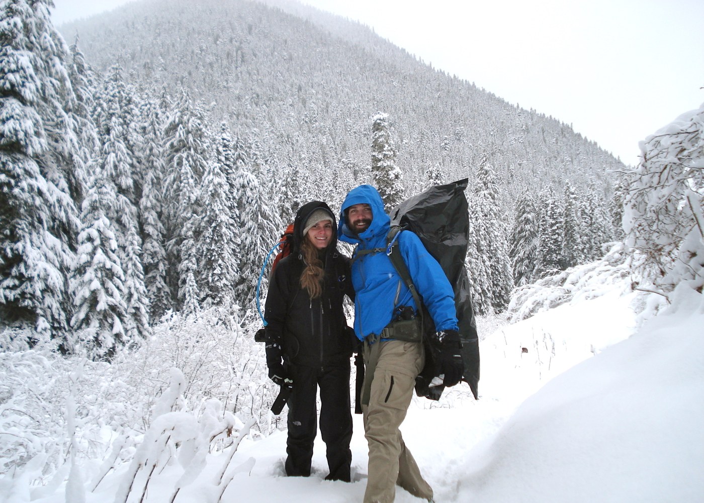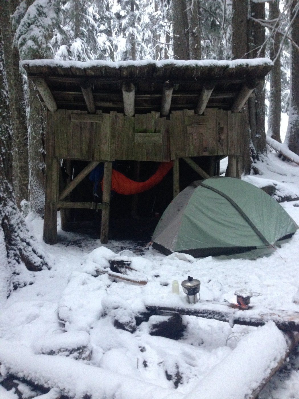 All night, we could hear wind gusts coming down off the mountains and then hitting the trees above us. That was followed by clumps of snow falling off of tree branches and pounding the ground around us. We woke up to a beautiful winter wonderland. The river is right there for water.